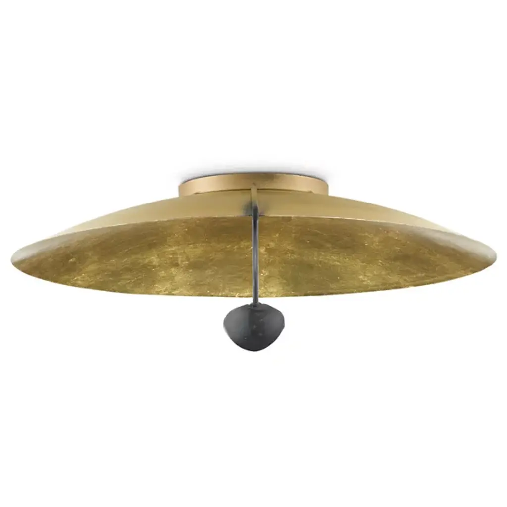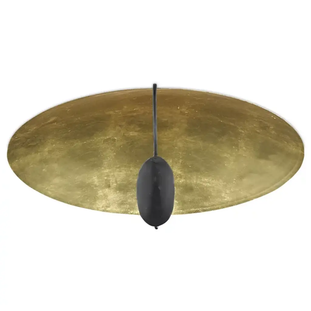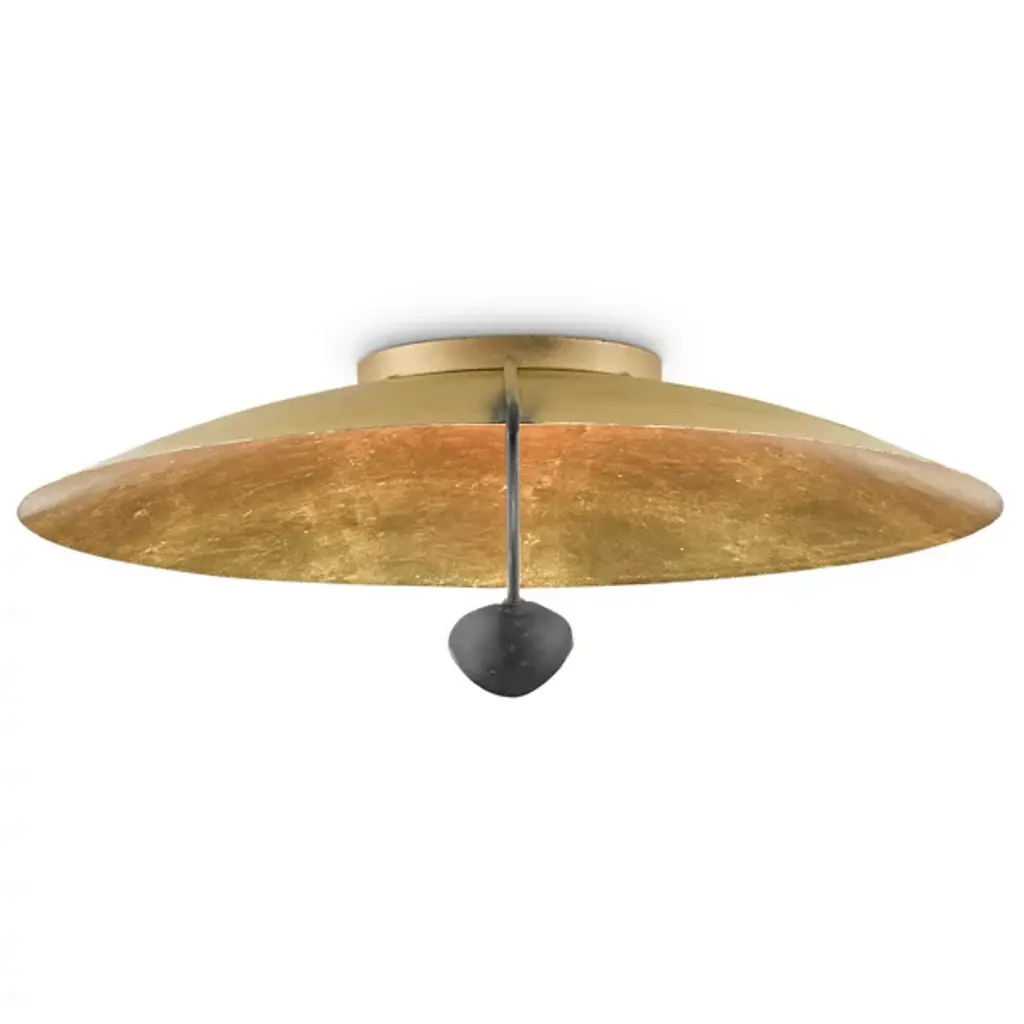 The Pinders Flushmount from Currey & Company features a hand-applied leaf finish, creating a rich, textured surface. The bulb is placed within a cup-like extension, attached to a slender, curved arm. The light reflecting off the gold interior enhances and intensifies the warmth of the illumination. This contemporary fixture's wrought iron construction ensures durability, while its handcrafted nature means each piece possesses subtle, one-of-a-kind variations. This innovative design's interplay of light and shadow promises to cast a captivating ambiance in any space.