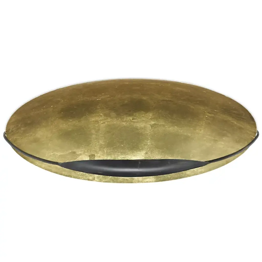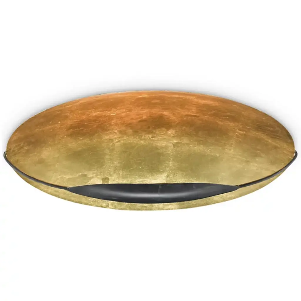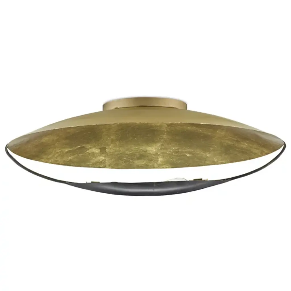 The Pinders Flushmount from Currey & Company features a hand-applied leaf finish, creating a rich, textured surface. The bulb is placed within a cup-like extension, attached to a slender, curved arm. The light reflecting off the gold interior enhances and intensifies the warmth of the illumination. This contemporary fixture's wrought iron construction ensures durability, while its handcrafted nature means each piece possesses subtle, one-of-a-kind variations. This innovative design's interplay of light and shadow promises to cast a captivating ambiance in any space.