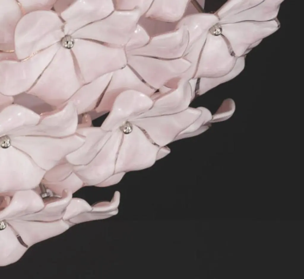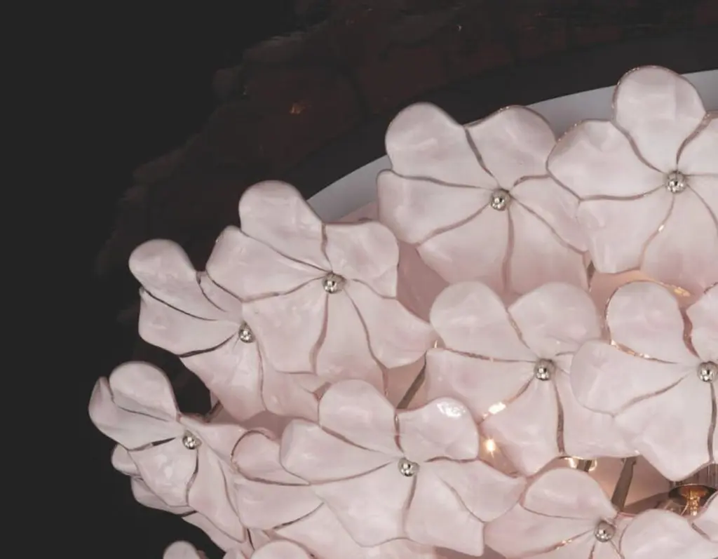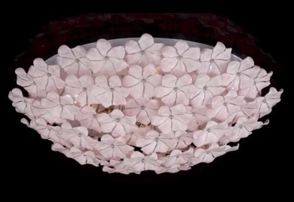 Italian flush mount with layered hand blown pink Murano lotus flowers mounted white metal structure / Made in Italy in the style of CenedeseMeasures: diameter 39.5 inches, height 12 inches9 lights / E12 or E14 type / max 40W eachOrder only / this item ships from ItalyOrder reference #: FABIOLTD C849