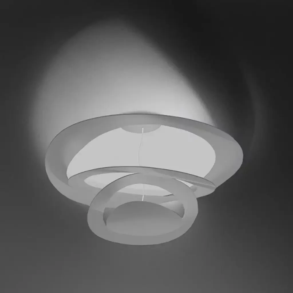 In contemporary spaces, the Artemide Pirce LED Flushmount adds mysterious, other-wordly style. Its design gives the impression of a spinning solar system, with a soft-sided aluminum disc cut into a column of tilting rings. A bright LED is housed in the bottom-most segment, shining upward and creating an intriguing play of light through the rings.