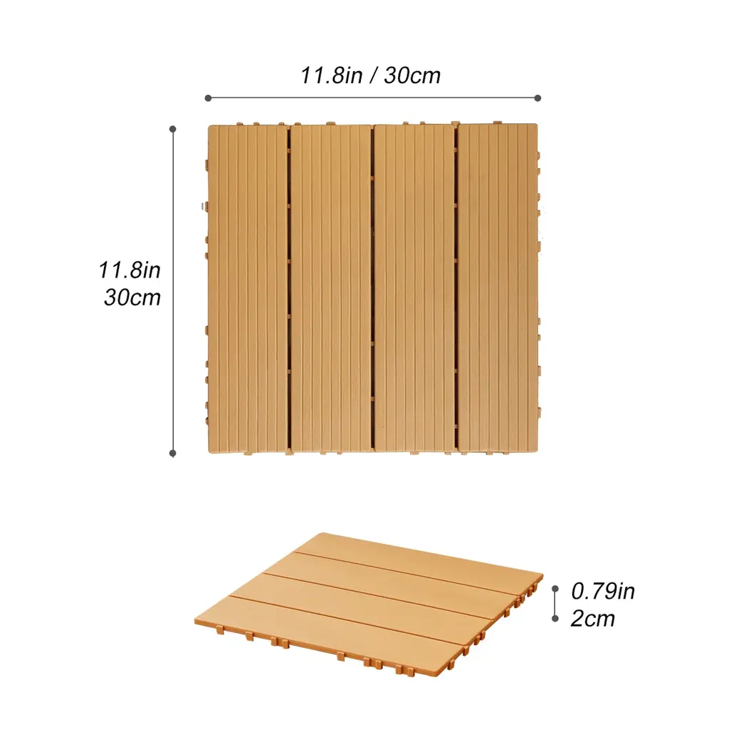【Sturdy & Tough Tiles】: Plastic interlocking deck tiles are made from premium quality, high-hardness plastic material. Durable and resistant to deformation, can withstand direct sunlight, rainstorm and snowstorm, which fits for being used all year round. Compared to wood deck tiles, it has better waterproofing, wear resistance and corrosion resistance. 【Easy & Quick Installation】: With our interlocking design, installing these deck tiles is a breeze. Simply snap the tiles together, and you'll have a beautiful and functional floor in no time. Also can also dismantle this porch flooring in minutes with ease.No need for any special tools or professional assistance. 【Efficient Drainage】: From the front, our patio deck tiles is composed of multiple drains,preventing water from pooling on the surface.This ensures that your outdoor space remains dry and safe, even during heavy rain or snowfall. In addition, the back of the deck flooring are designed with a rhombic structure, which provides better support and stability, increases the contact area between the tiles and the ground, and ensure the slip resistance of the tiles. 【Easy Maintenance】: Our decking tiles are designed to be low-maintenance, easy to clean and maintain, saving you time and effort. Just flushed with water gun and other cleaning tools takes to keep them looking great. 【Versatile Flooring】: Interlocking deck tiles suitable for Indoor and Outdoor Use. Whether you want to enhance your patio, balcony, deck, pool area, garden, backyard, porch, pathways, pavers, bathroom, or any other space, these tiles are the perfect choice. Our decking outdoor flooring not only enhances the beauty but also adds functionality to your space.