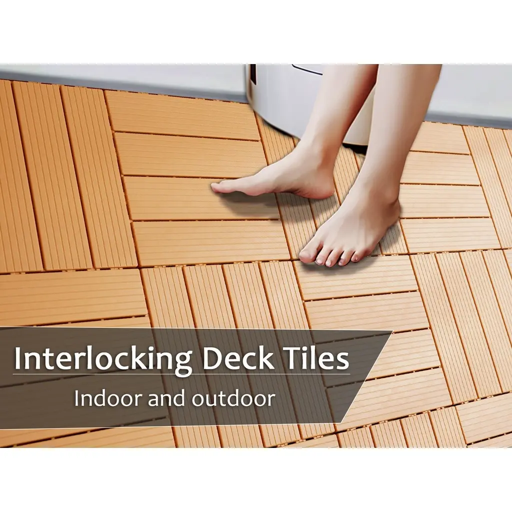 【Sturdy & Tough Tiles】: Plastic interlocking deck tiles are made from premium quality, high-hardness plastic material. Durable and resistant to deformation, can withstand direct sunlight, rainstorm and snowstorm, which fits for being used all year round. Compared to wood deck tiles, it has better waterproofing, wear resistance and corrosion resistance.【Easy & Quick Installation】: With our interlocking design, installing these deck tiles is a breeze. Simply snap the tiles together, and you'll have a beautiful and functional floor in no time. Also can also dismantle this porch flooring in minutes with ease.No need for any special tools or professional assistance.【Efficient Drainage】: From the front, our patio deck tiles is composed of multiple drains,preventing water from pooling on the surface.This ensures that your outdoor space remains dry and safe, even during heavy rain or snowfall. In addition, the back of the deck flooring are designed with a rhombic structure, which provides better support and stability, increases the contact area between the tiles and the ground, and ensure the slip resistance of the tiles.【Easy Maintenance】: Our decking tiles are designed to be low-maintenance, easy to clean and maintain, saving you time and effort. Just flushed with water gun and other cleaning tools takes to keep them looking great.【Versatile Flooring】: Interlocking deck tiles suitable for Indoor and Outdoor Use. Whether you want to enhance your patio, balcony, deck, pool area, garden, backyard, porch, pathways, pavers, bathroom, or any other space, these tiles are the perfect choice. Our decking outdoor flooring not only enhances the beauty but also adds functionality to your space.