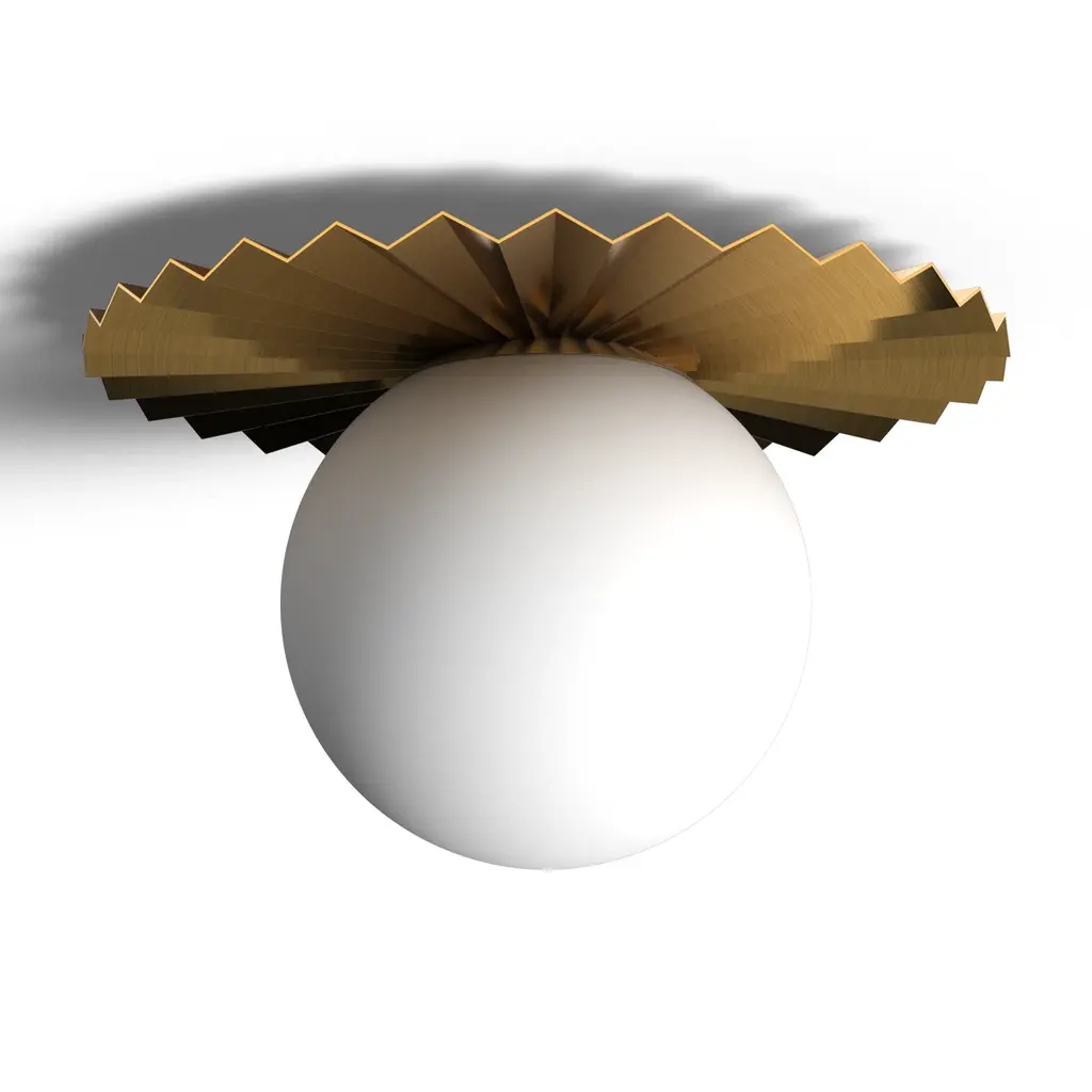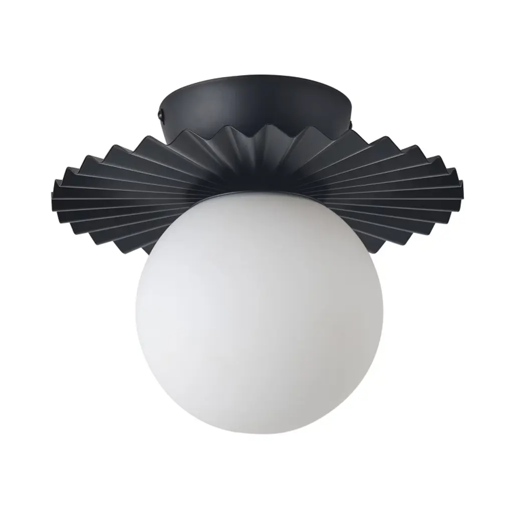 Like a piece of couture, tailored to perfection. The Plume Flushmount from Alora Mood lifts the spirits of the room with a design that references today’s high style. The flushmount’s deliberate choice of clean shapes makes it feel welcome in the modern or contemporary setting. Evoking a long, flowy gown, a jagged metal plate rests the piece flush against the wall with gripping radiating lines. The plate pairs its style with substance by functionally helping to reflect the light down into the room. The opal glass globe pops visually like a bright earring with a warm glaze from the lamping. The radiant shape delivers a cozy atmospheric light to its surroundings.