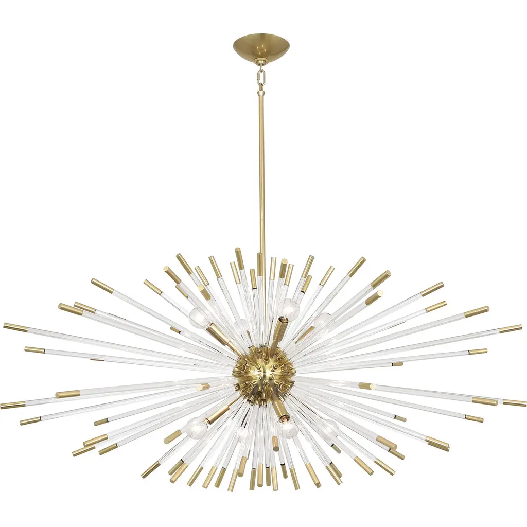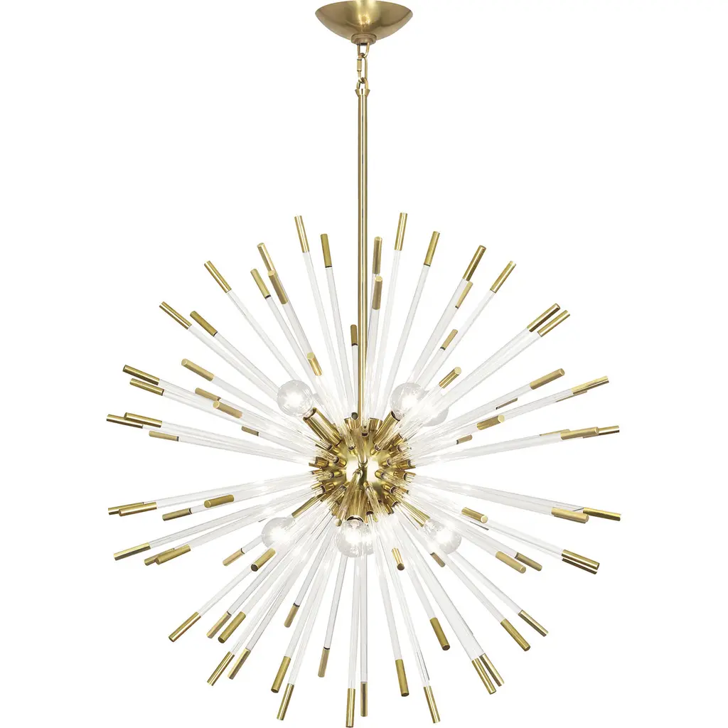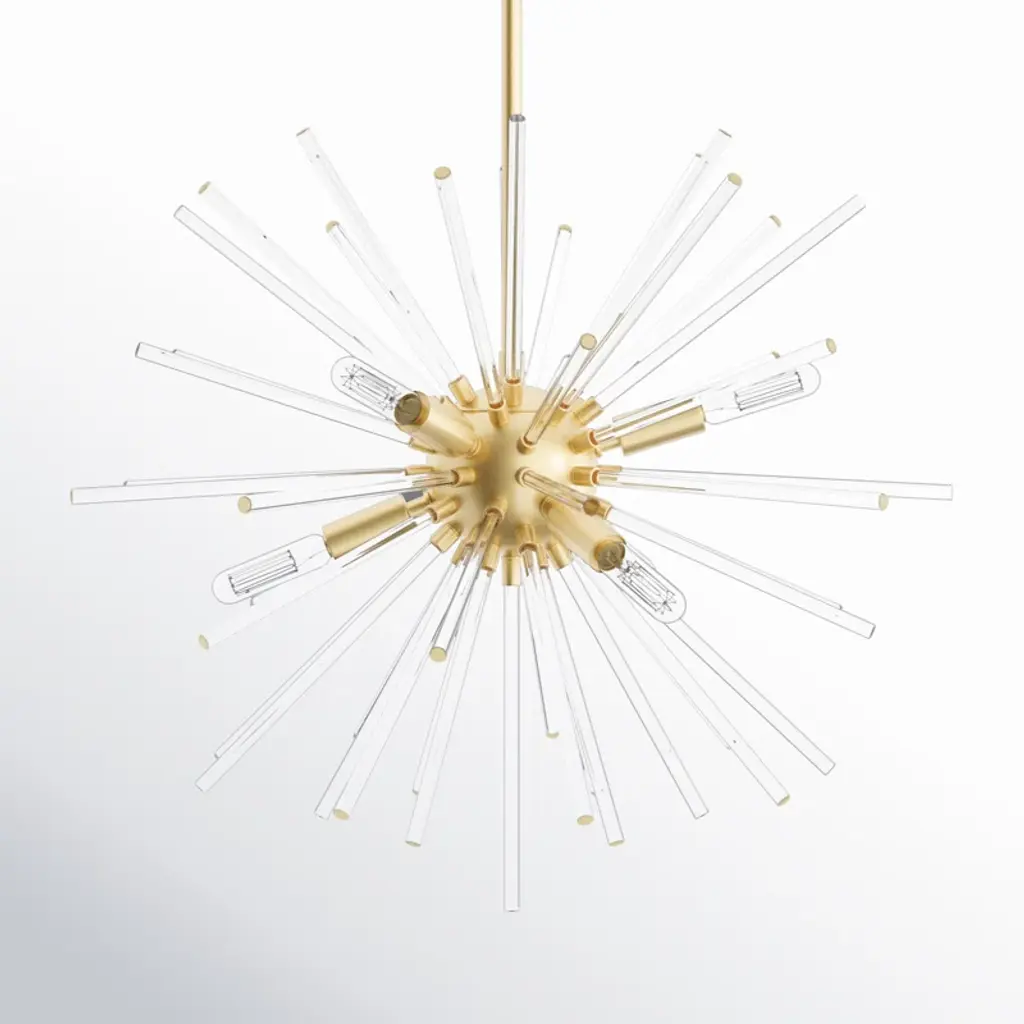 A dazzling burst of Clear glass rods extend from a classic sputnik shape finished in a bright Polished Chrome or warm Satin Brass. Available in two sizes of pendants and as a ceiling fixture, this unique look is a statement piece designed to attract attention.