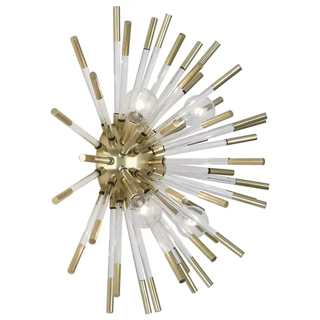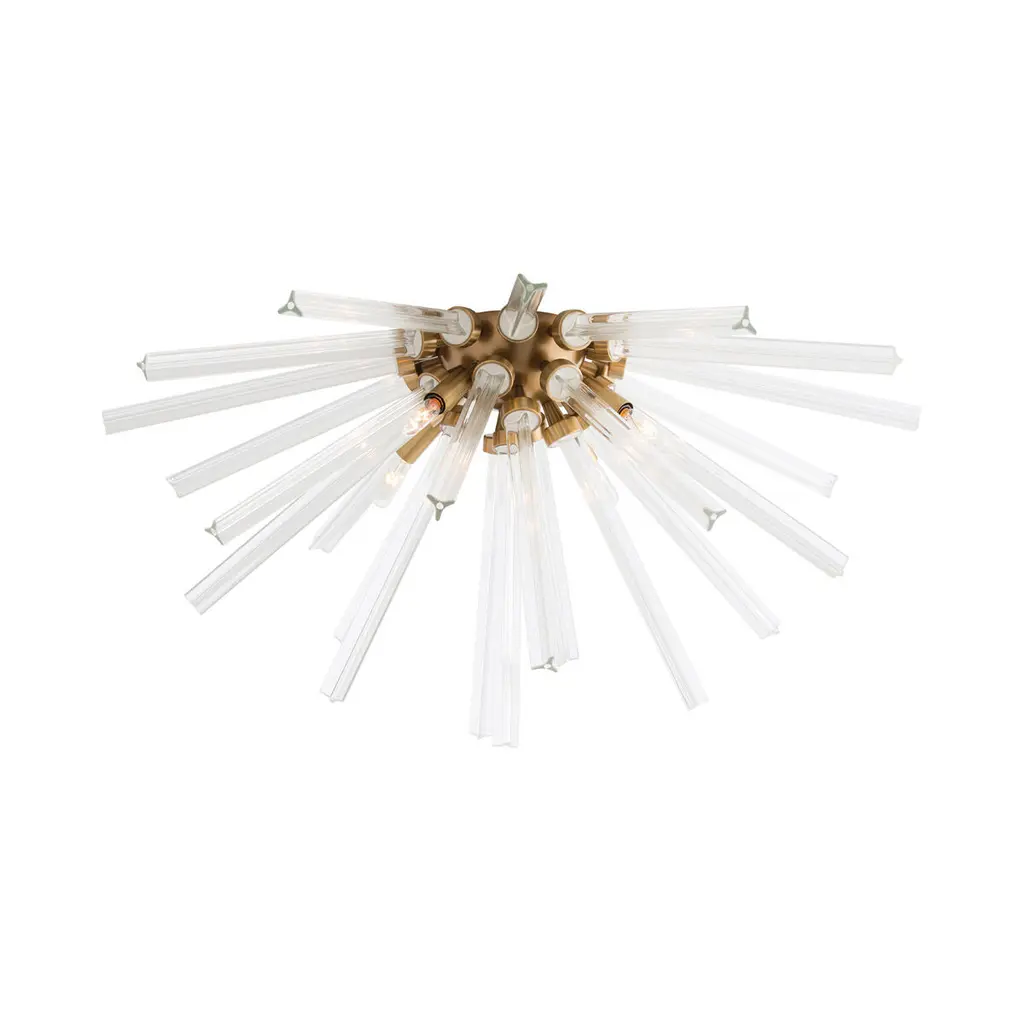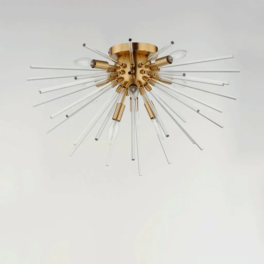 A dazzling burst of Clear glass rods extend from a classic sputnik shape finished in a bright Polished Chrome or warm Satin Brass. Available in two sizes of pendants and as a ceiling fixture, this unique look is a statement piece designed to attract attention.