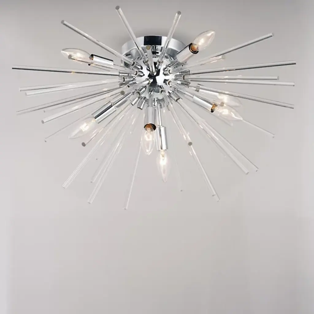 A stellar piece freezing in time a burst of sheer energy. The Polaris Flushmount from Maxim Lighting is a ravishing twist on an evocative mid-century modern design: the sputnik. Like the rounded silhouette of the Polaris star in the night sky, a globe body sits along a flat ceiling with a wondrous delight. Rays of glass radiate out in sleek outlines that pierce the air. Interspersed between them are traditionally-styled lamp holders, standing out with a slick polish. Its permeating glow fills rooms with an endearing warmth, leaving behind a glittering trail of highlights.