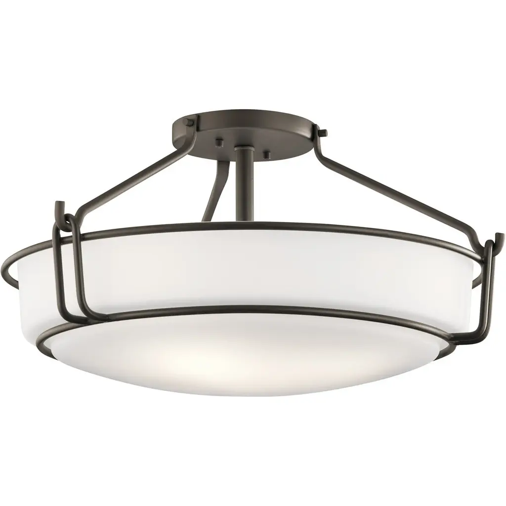 Concentric steel bands circle the glass bowl. Handcrafted steel tines hold the bowl. This modern fixture is crafted using a mix of tradition and technique by artisans at our forge here in Vermont.