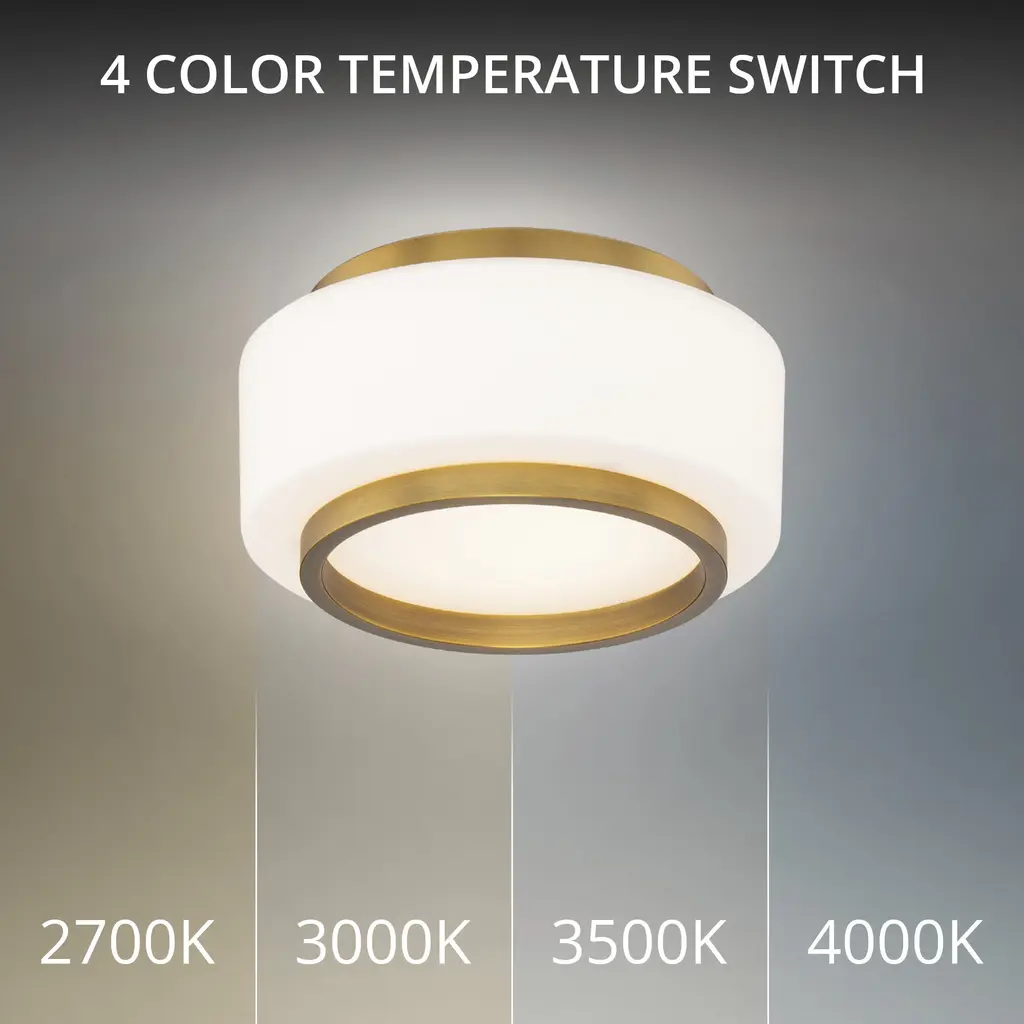 Elevate your ceiling with the elegant Preston flush mount light defined by its dramatic opal shade encased in a polished circular frame. The etched shade softly diffuses the light from integrated, color temperature selectable LEDs, creating a warm and inviting glow. Offered in both 8 and 16-inch sizes, Preston is available in aged brass or black finishes.