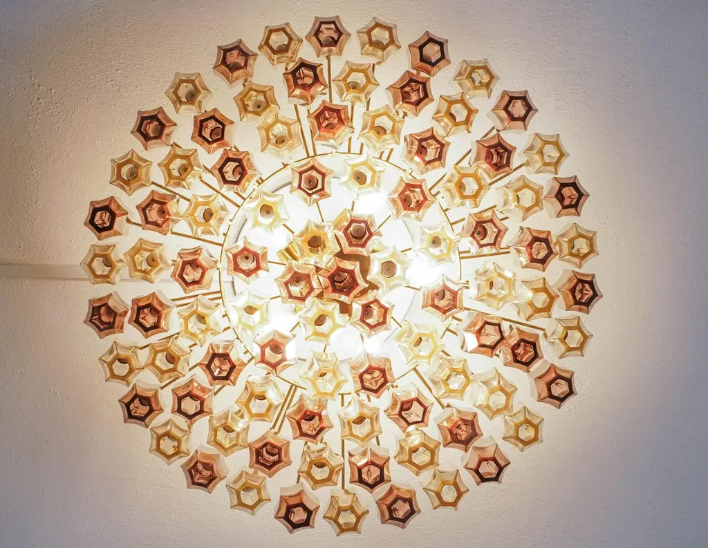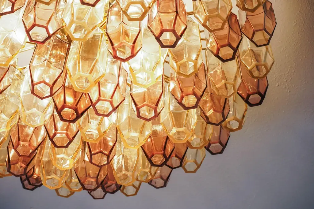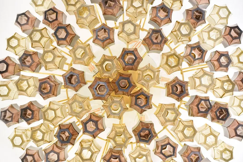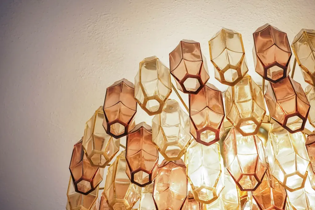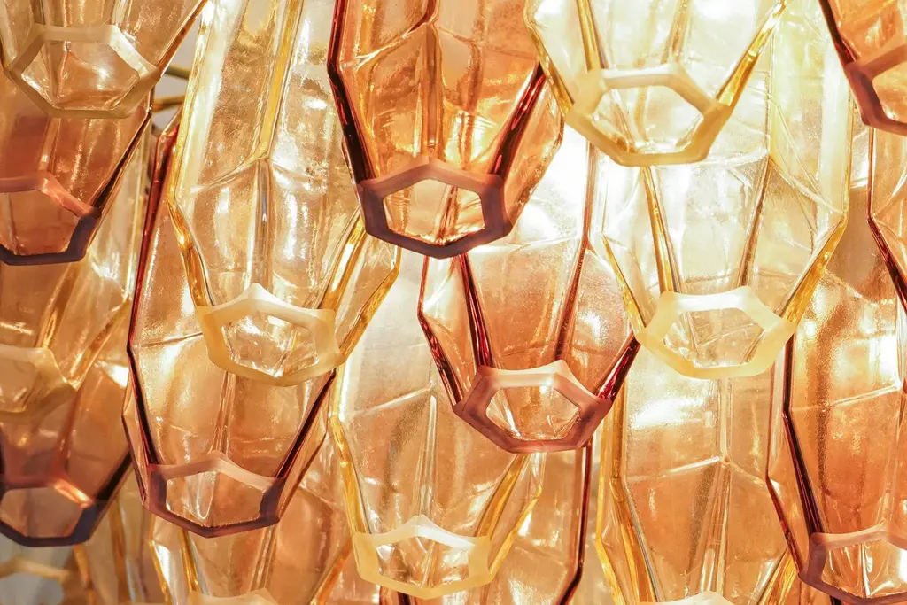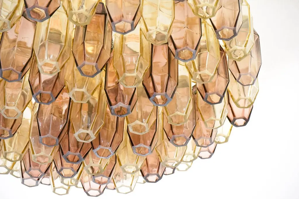 This prismatico glass chandelier in light amber and amethyst is the compact version of the prismatico collection, featuring 91 blown glass elements and a 65 cm (26") diameter. the design incorporates pencil-shaped glass elements arranged to form a compact barrier, concealing the hardware and offering a seamless glass view. The concave sides of each prism act as a magnifying lens, effectively hiding the hardware and creating the appearance of floating glass elements. technically, i used light dispersion through refraction rather than the traditional diffraction method. This approach allowed me to avoid the rough or hammered texture typically seen in multiple blown glass elements, resulting in smooth, clean surfaces with crisp edges. This unique technique sets my design apart. created by silvio piattelli in 2021, this collection presents a modern approach to multi-glass fixtures. The hardware is finished in warm satin brass, with glass elements secured by solid brass fittings. the chandelier can be installed with a hardwired stem for flush mounting or with an optional chain for high ceilings. the showcased version features light amber glass and amethyst mixed together, the warm rose amethyst matches perfectly the light amber providing a warm, cozy and unique light. with a capacity for 5 bulbs, each up to 60w, the chandelier delivers 3400 lumens, suitable for both bright and subdued lighting needs. the prismatico chandelier is offered in various sizes to suit different spaces. specifications: height: chandelier canopy and chain 32" (90cm) chandelier body: 13 inches (32,5cm) diameter: 26 inches (65 cm) weight: 44 lbs (20 kg) bulbs: 6x e12/e14 base up to 250v (europe/uk standard).
