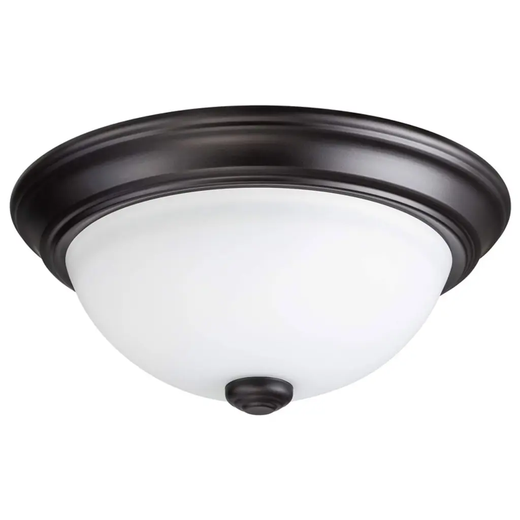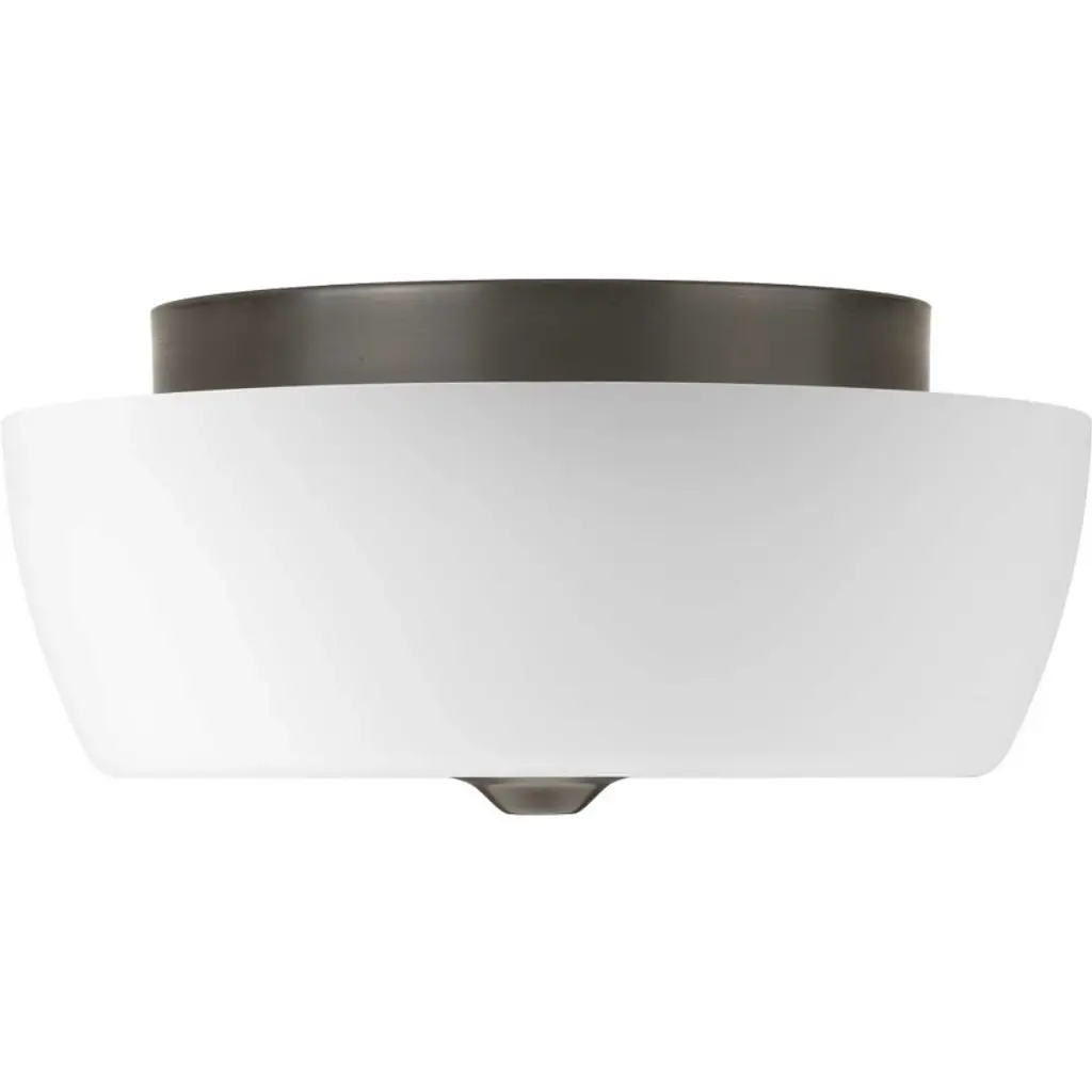 Elevate your space with the Leap Collection's two-light flush mount from Progress Lighting. Crafted with durable steel and an elegant Antique Bronze finish, this fixture adds sophistication to any room. With a width of 14 inches and a height of 6.63 inches, it seamlessly blends with your ceiling for a modern look. The incandescent lamping with two 60-watt bulbs casts a warm glow through etched glass shades, complementing contemporary decor. Damp rated for moisture-rich environments, it comes with a 10-inch canopy and shade for a finished appearance. The Leap Collection's flush mount light is a stylish and practical choice for updating your home's ambiance.