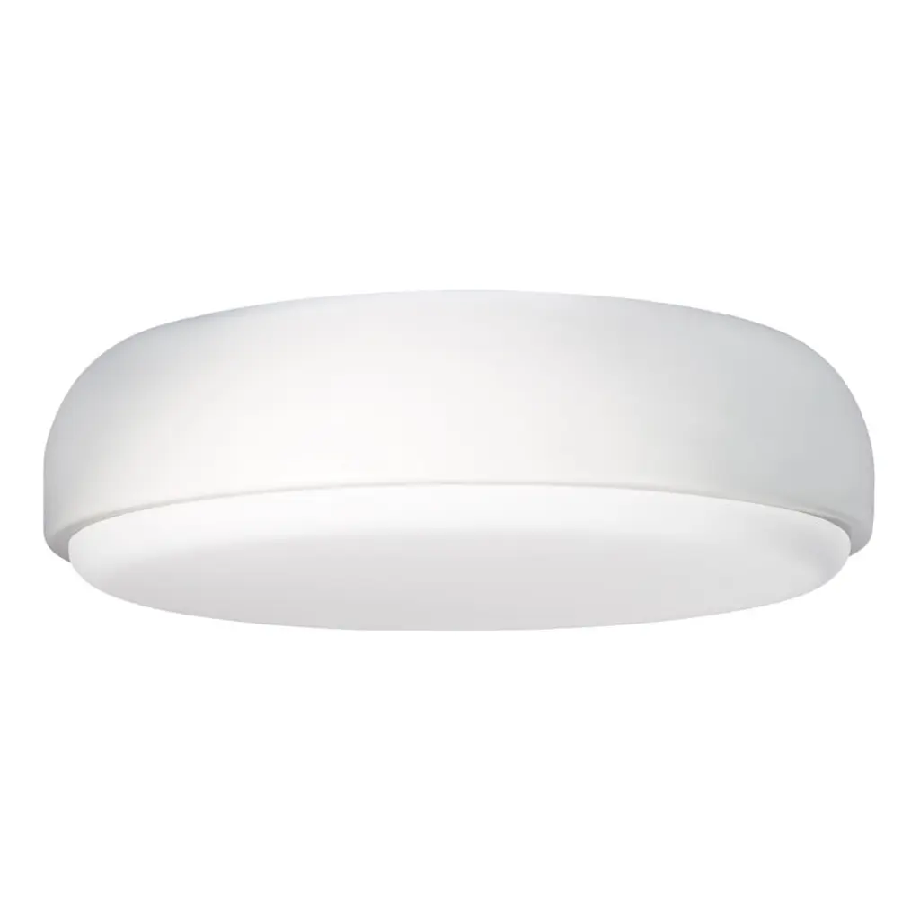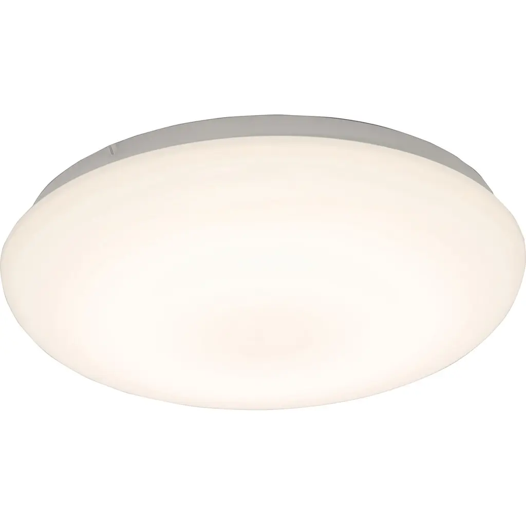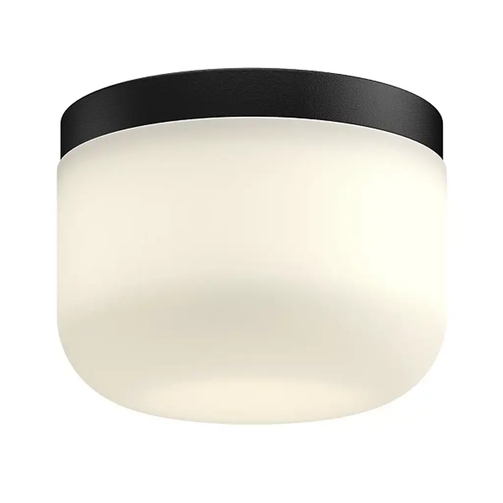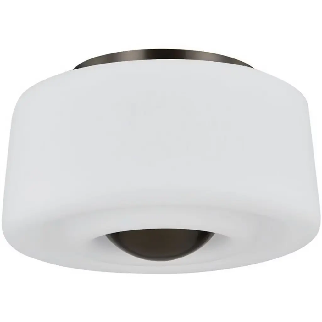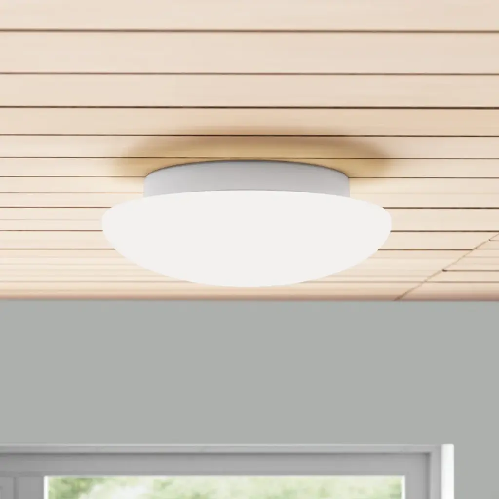 This flush mount light leans into its pared-down, minimalist silhouette with a simplified design. Crafted from metal and glass, it features a simple silhouette with a wide circular mounting plate and an understated bowl shade. The shade is made from white frosted glass, helping to diffuse the light of the 60W bulbs (sold separately) evenly throughout your space. This fixture is rated for damp spaces, and is compatible with dimmer switches for versatile light.