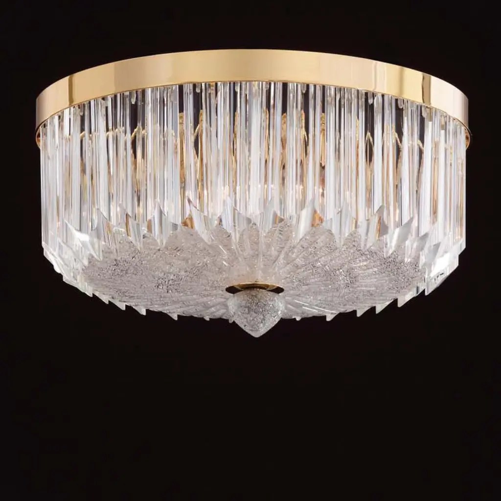 Italian modern flush mount with a round layer of clear Murano quadriedri glasses, enclosed with a clear bottom Murano glass diffuser hand blown with Graniglia to produce granular textured effect, mounted on gold finish frame / Made in Italy4 lights / E26 or E27 type / max 60W eachDiameter: 16.5 inches / Height: 8 inchesOrder Reference #: FABIOLTD C1024
