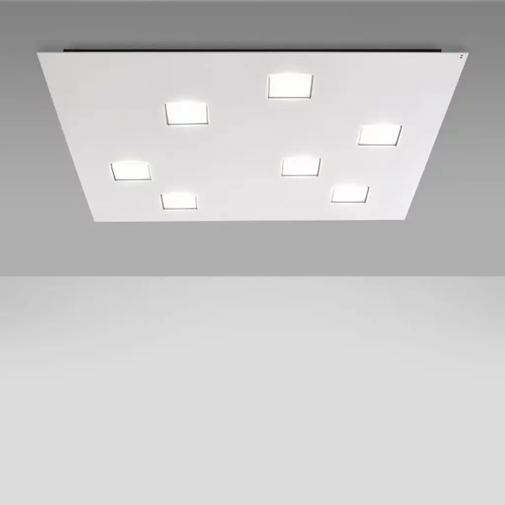 Movement and order wrapped together in a stellar contemporary Italian piece. Anyone with a taste for sophistication and clean shaped designs can appreciate the Quarter 7-Light LED Flushmount from Fabbian. Created by Pellegrini + Mengato Design, LED-lit cubes produce an elegant formation of light and shape. The polycarbonate cubes move about freely in an asymmetrical fashion along a broad aluminum plate, producing a formation of clean encompassing lighting. Its lifted square aluminum structural plate gives each cube enough room to be individually appreciated, while also providing a sense of order to the overall piece.