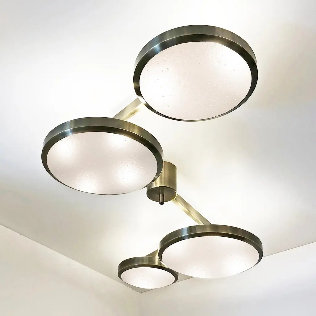 The Quattro ceiling light plays with the notion of lines and shapes, bringing the concept to life with its distinctive winding frame with four variable size shades at staggered heights. The first images show the fixture in our polished brass finish-subsequent pictures show it in a selection of alternative finishes. Starting at $13,500 for standard finishes.Starting at $14,900 for premium finishes.Customization Options: Each fixture is hand crafted in Italy and can be customized in size, layout and number of shades. Available in any of our 10 finishes and 8 enamel colors. Compatible with our Murano bubble glass and Murano frosted glass. Can be installed as a flush mount or on a stem.Lead Time: 10-12 weeks plus shipping. May be available for quick ship in 6 weeks or under.Width: 66”Depth: 34”Height: 11”. Overall height can be adjusted as needed. 9” minimum heightElectrical: Twelve E12 40W incandescent or 75W LED equivalentModel#: LTZ668