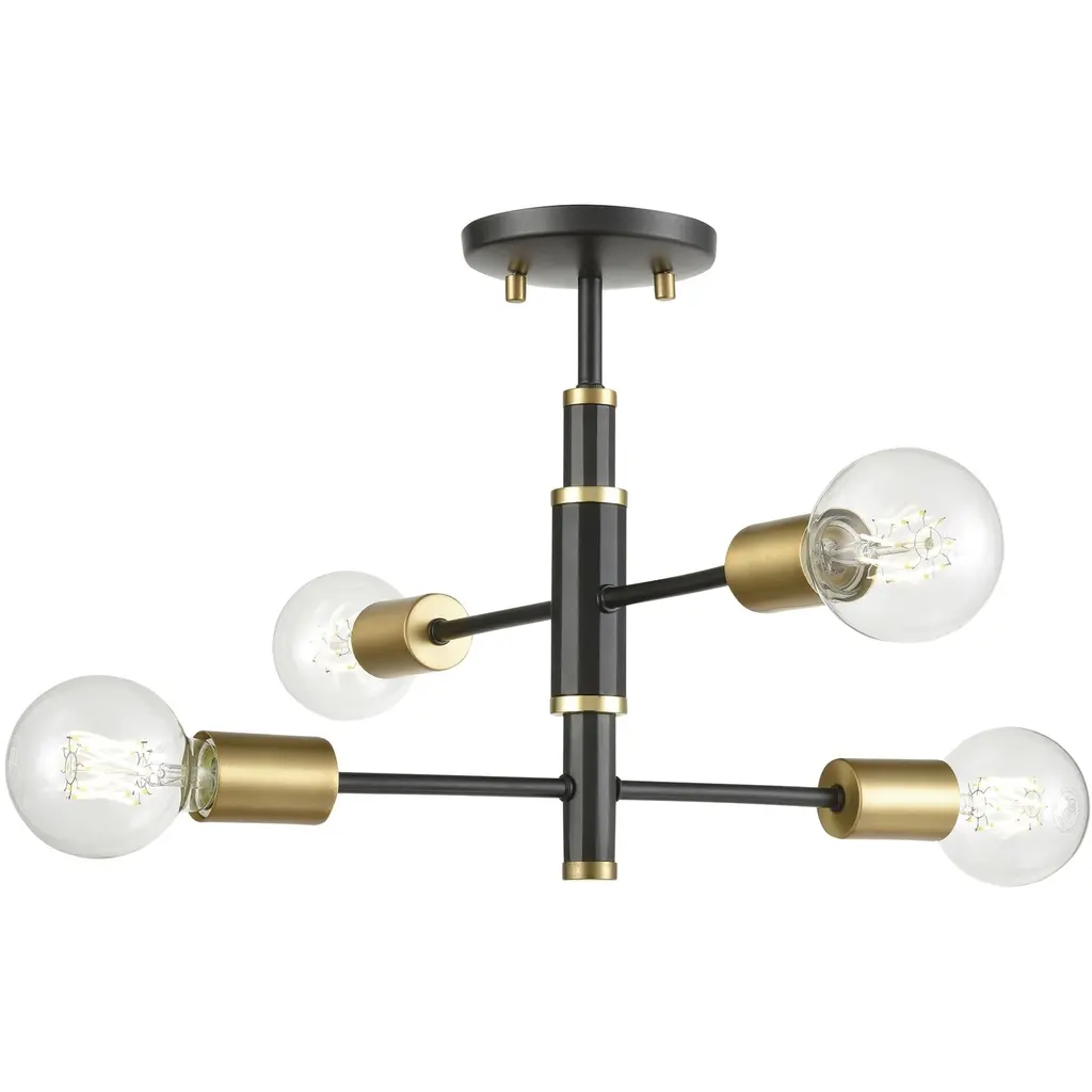 Five Light Flush Mount from Latitude collection in Western Bronze finish. Number of Bulbs 5. Max Wattage 100.00 . No bulbs included. Latitude updates a retro silhouette with simple yet modern accents for a fun transitional look. Subtle angles pay homage to the asymmetry of midcentury design, while a two-tone finish in Western bronze and painted brass adds chic versatility. Pair with vintage filament bulbs for maximum flair. No UL Availability at this time.