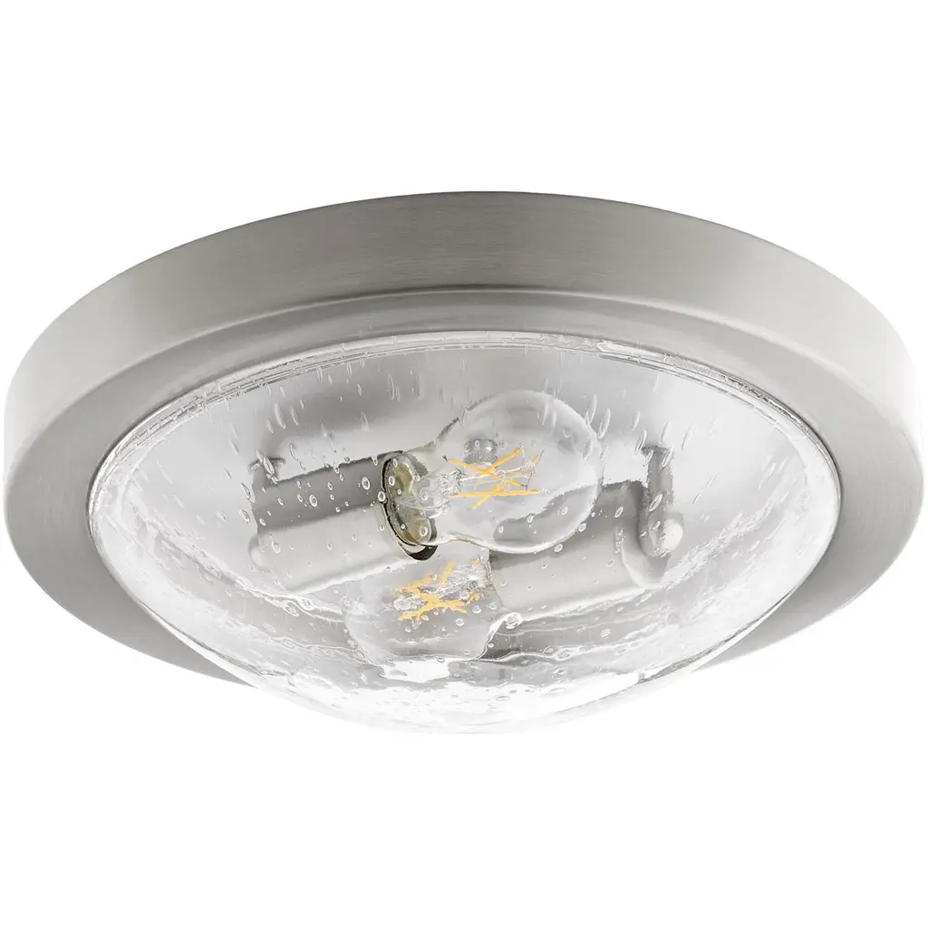 Material: Glass, Finish Color: Satin Nickel, Width: 13", Height: 3.75", Hanging Method: Flush, Number Of Bulbs: 2, Wattage: 40 Watts, Dimmable: No, Moisture Rating: Damp Rated, Desc: Add a relaxing and refreshing ambiance to any space with this ceiling mount. This fixture toes the line of minimal-modern and comes equipped with two medium base sockets in a Satin Nickel finish, coupled with a clear seeded glass shade, this luminous accent will help give your space a perfect warm glow. Shade Included: Yes. ,