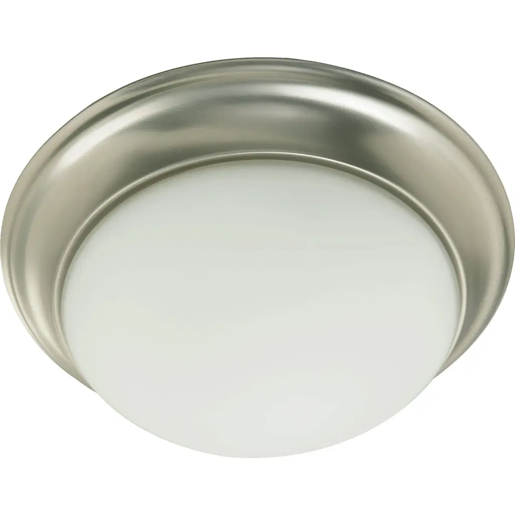 Collection: Contempo, Finish Color: Satin Nickel, Width: 11", Height: 3.75", Hanging Method: Flush, Number Of Bulbs: 2, Wattage: 13 Watts, Dimmable: No, Moisture Rating: Damp Rated, Desc: Shade Included: Yes. ,