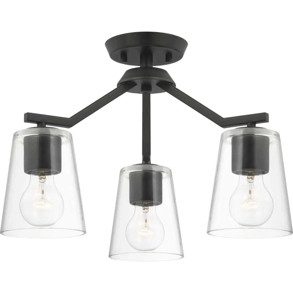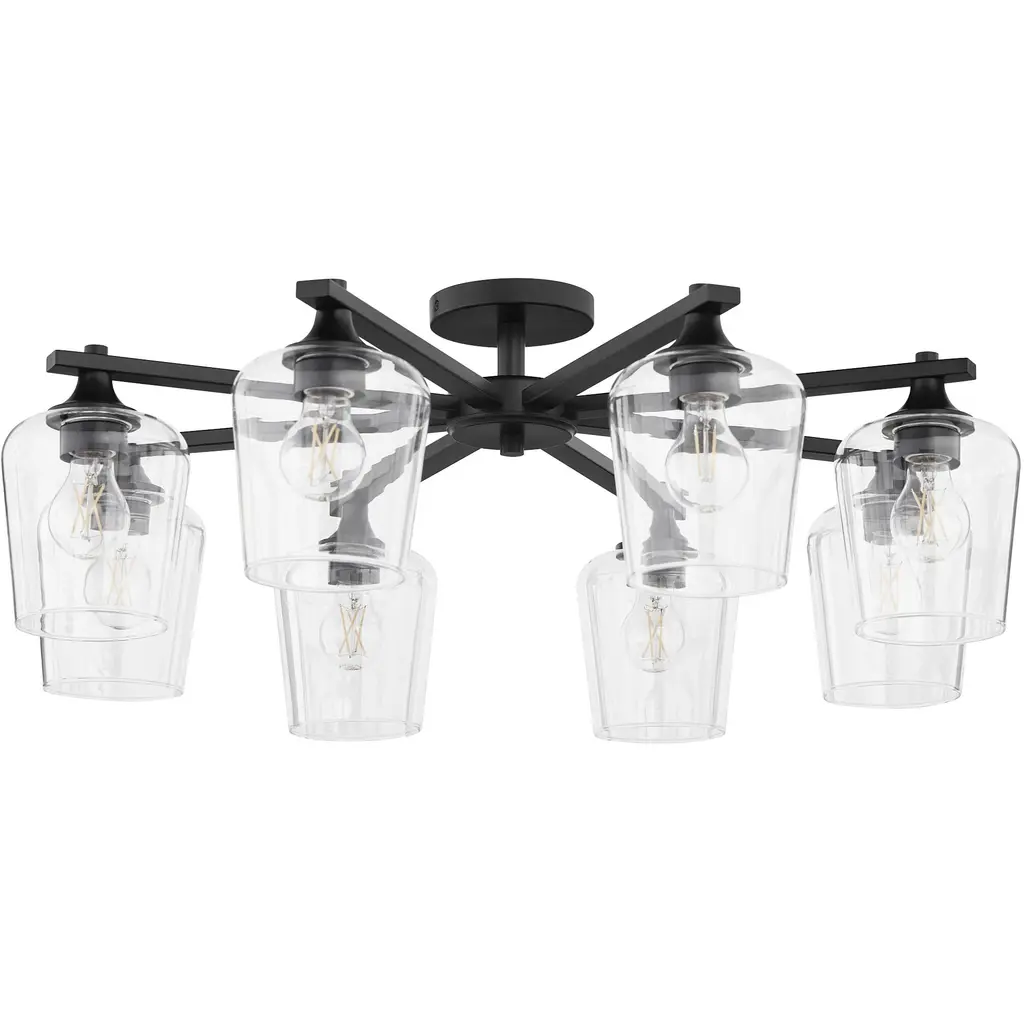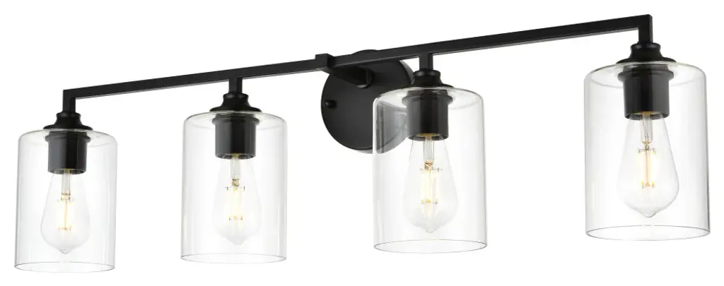 Collection: Veno, Finish Color: Matte Black, Width: 22", Height: 11.25", Lamping Type: Incandescent, Number Of Bulbs: 4, Wattage: 100 Watts, Moisture Rating: Damp Rated, Desc: Angular frames and clear glass shades work together to create the traditional appeal of the Veno family of lighting. Matte black and aged brass finishes are offered in ceiling mounts, wall mounts, vanities, chandeliers, and pendants. Add classic comfort to your home's appeal with the Veno family of lights. Requires 4 - 100 Watt / Medium Base Bulbs / Clear Glass Shade / Damp Listed. ,