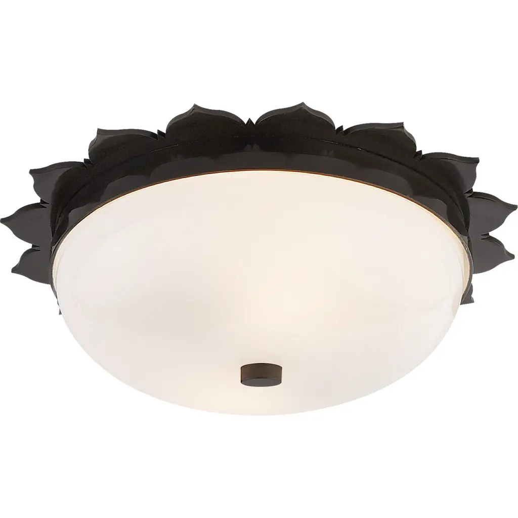 This mounted light, styled after a traditional sunflower, illuminates the room it adorns. The dimensional brass design is completed with a round white glass shade for a compelling look.