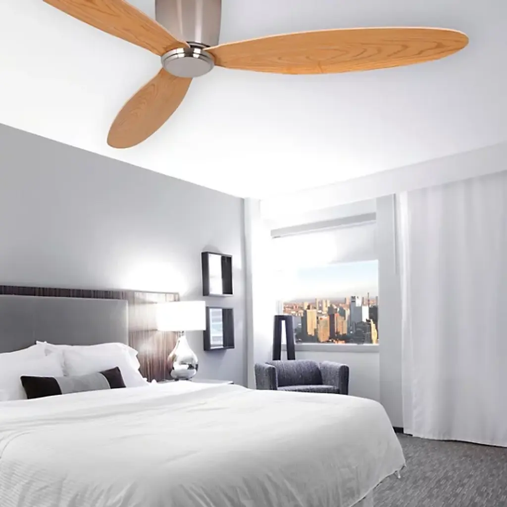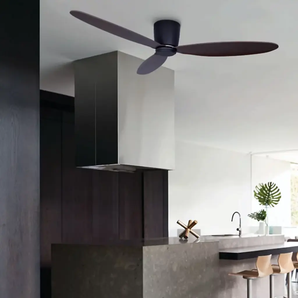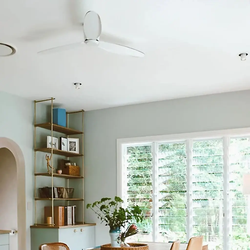 The Radar Lucci Air Flushmount Ceiling Fan from Beacon Lighting sits close to the ceiling, showcasing a clean, ultra-modern form that pairs its straightforward design with fabulous functionality. Designed by Lucci Air, three slim, curving blades spin out, powered using a strong DC motor to maintain quiet air circulation. A handheld remote control lets the fan spin and adjust through six speeds. The efficient design is both pleasing and practical, created with efficiency in mind and using around 40% less power while providing the same airflow.