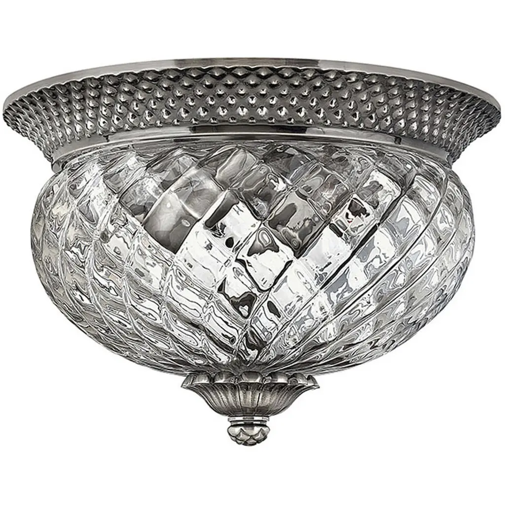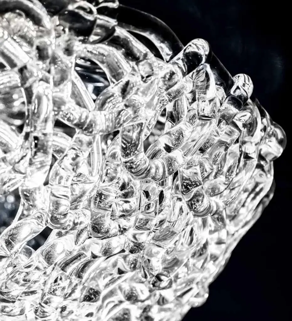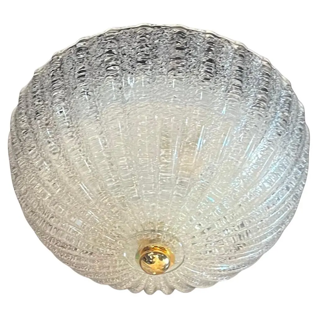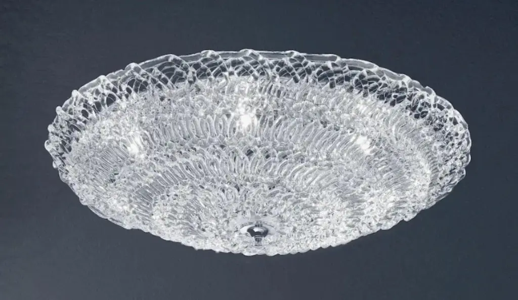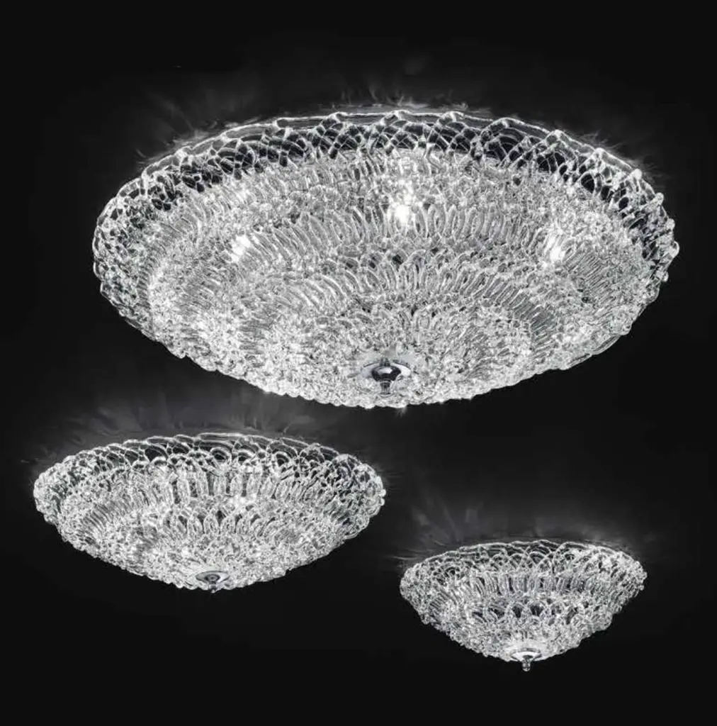 Italian flush mount with clear Murano glasses hand blown to form an organic cobweb texture, mounted on chrome finish frame / Made in Italy 6 lights / G9 type / max 40W each Measures: Diameter 31.5 inches / height 6 inches Order only / This item ships from Italy Order reference #: FABIOLTD C292