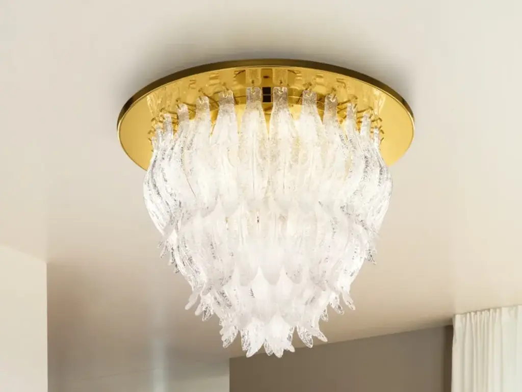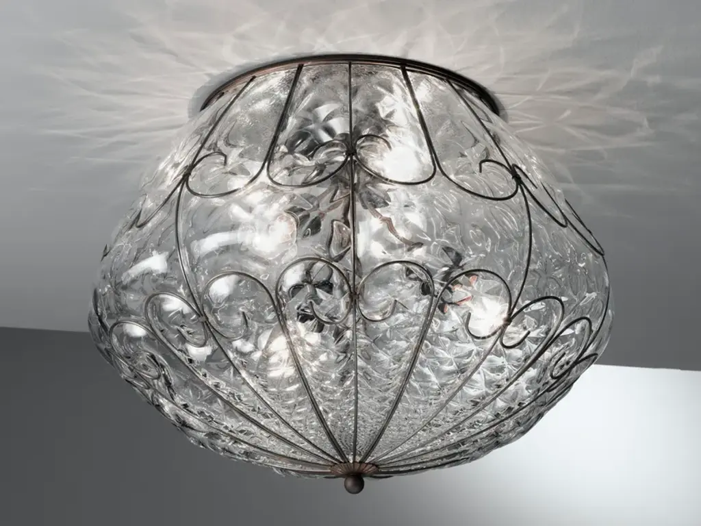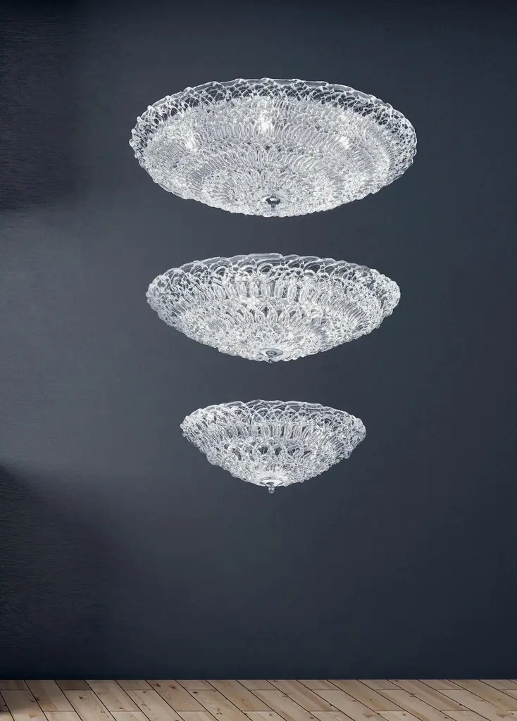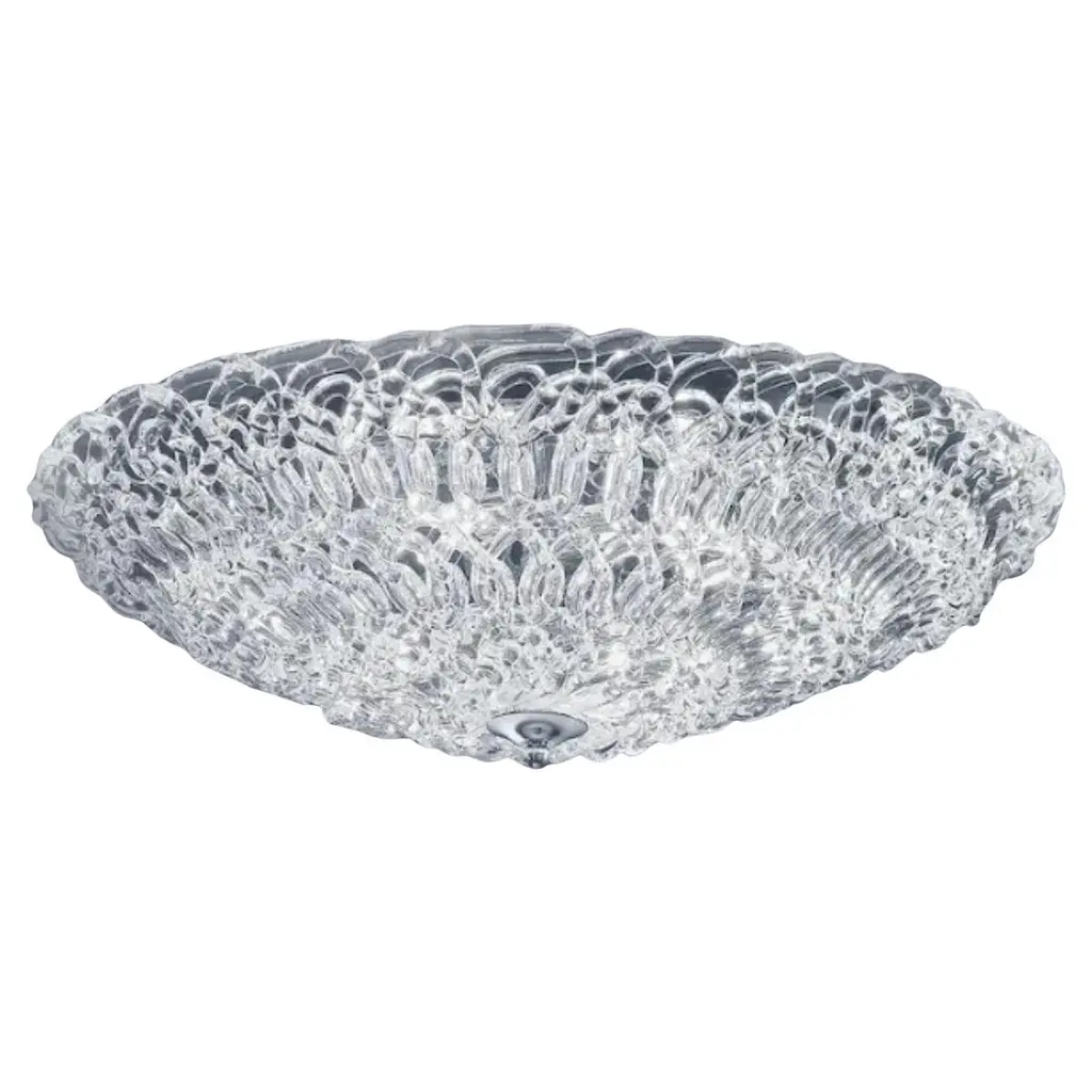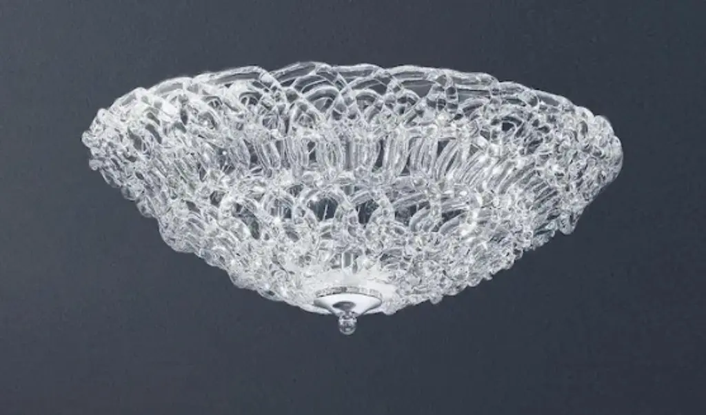 Italian flush mount with clear Murano glasses hand blown to form an organic cobweb texture, mounted on chrome finish frame / Made in Italy3 lights / G9 type / max 40W eachMeasures: Diameter 19 inches / height 5 inchesOrder only / This item ships from ItalyOrder reference #: FABIOLTD C290