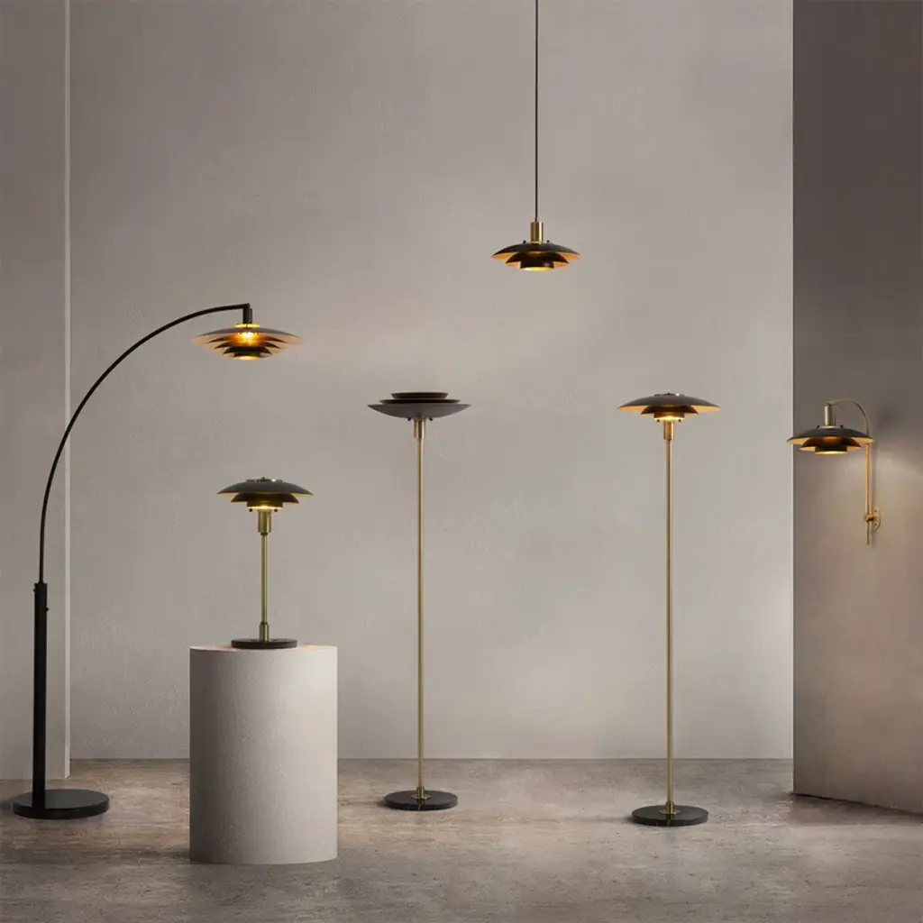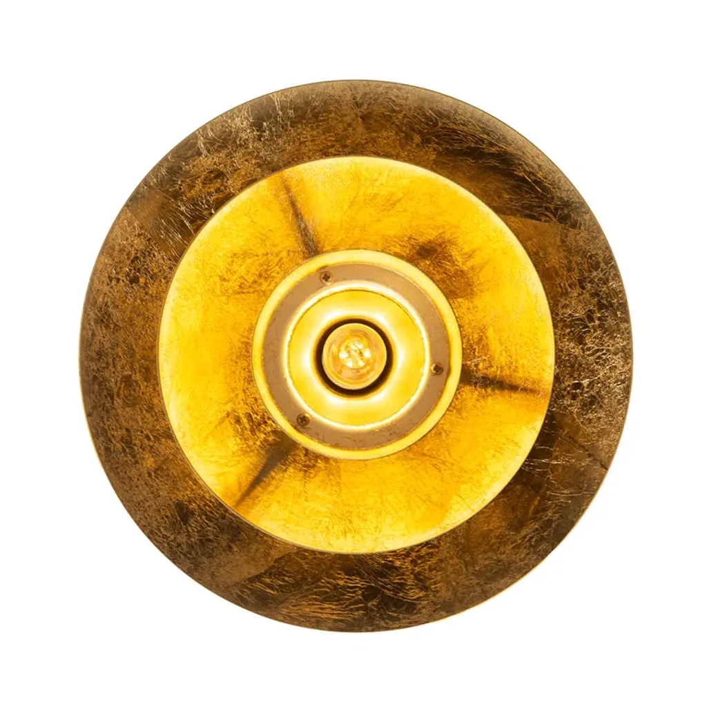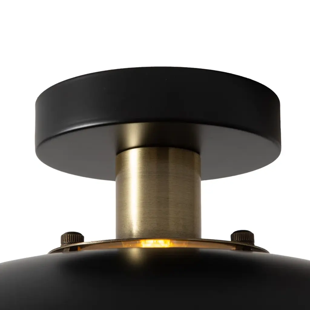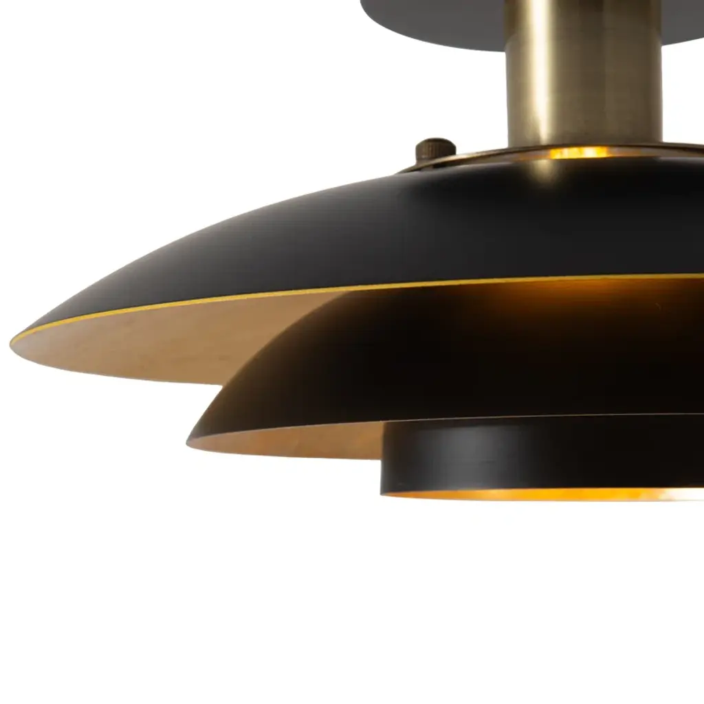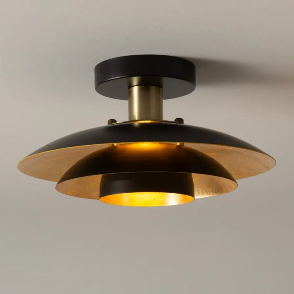 The Rancho Mirage Flush Mount Ceiling Light, a luminary masterpiece that brings a touch of vintage-inspired elegance to your overhead space. Crafted with meticulous precision, this ceiling light features a weathered brass finish and a matte black sculptred shade, creating a captivating interplay of light and shadow. The hand-applied gold-leaf finish underneath the shade casts a warm and inviting glow, transforming any room into a sanctuary of ambient charm and refined style.