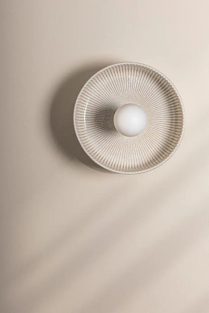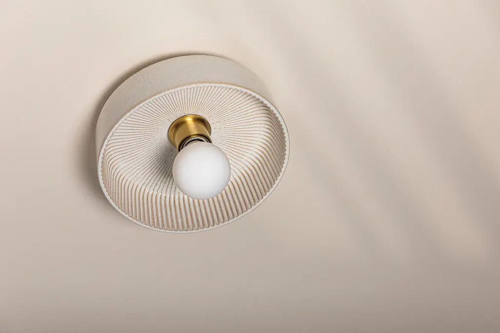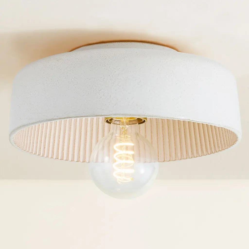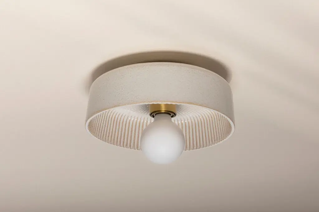 A contemporary flush mount with a drum-shaped shade, Ray serves as a powerful downlight. The reactive white ceramic resembles a limestone wash, adding texture and a rustic beauty. Reminiscent of a mushroom cap, the fluted interior brings a sense of organicism to the fixture.