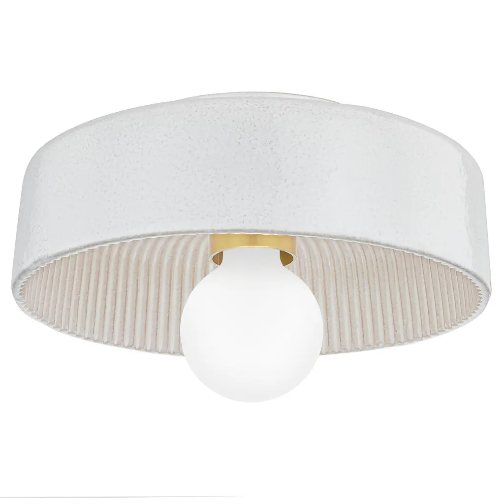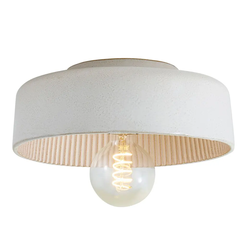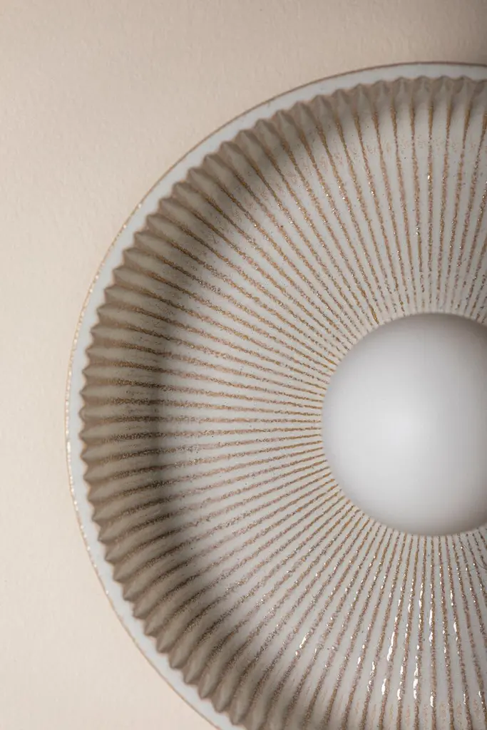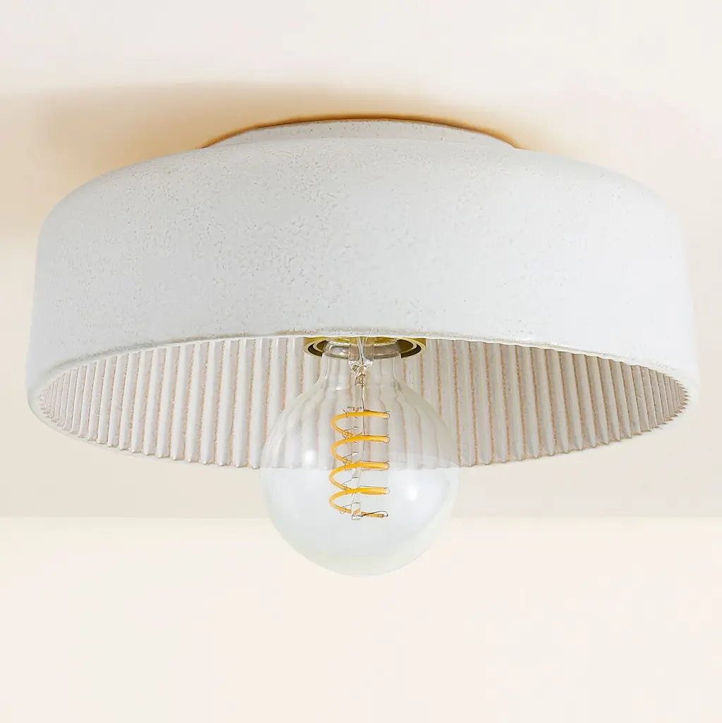 A contemporary flush mount with a drum-shaped shade, Ray serves as a powerful downlight. The reactive white ceramic resembles a limestone wash, adding texture and a rustic beauty. Reminiscent of a mushroom cap, the fluted interior brings a sense of organicism to the fixture.