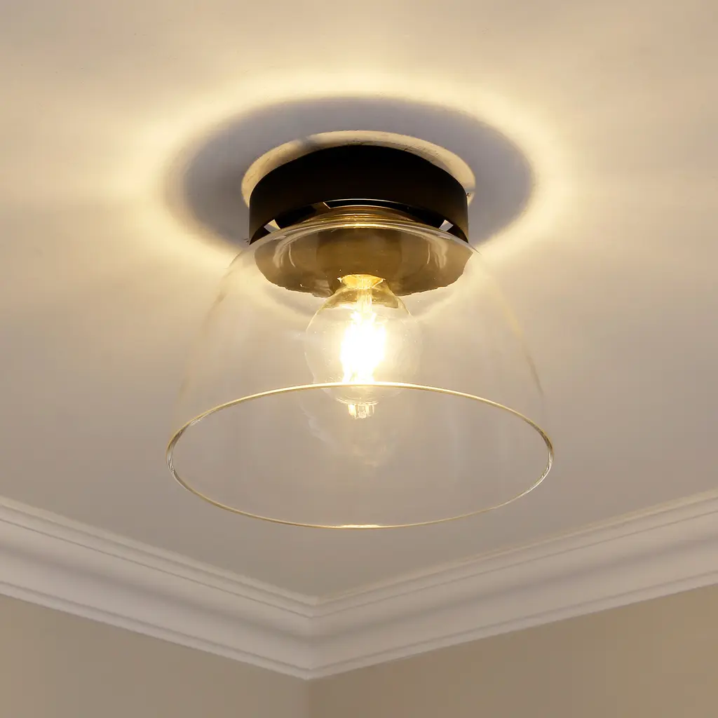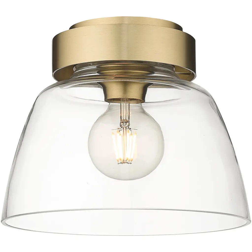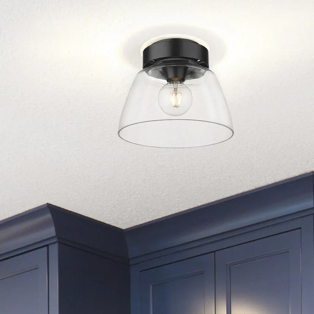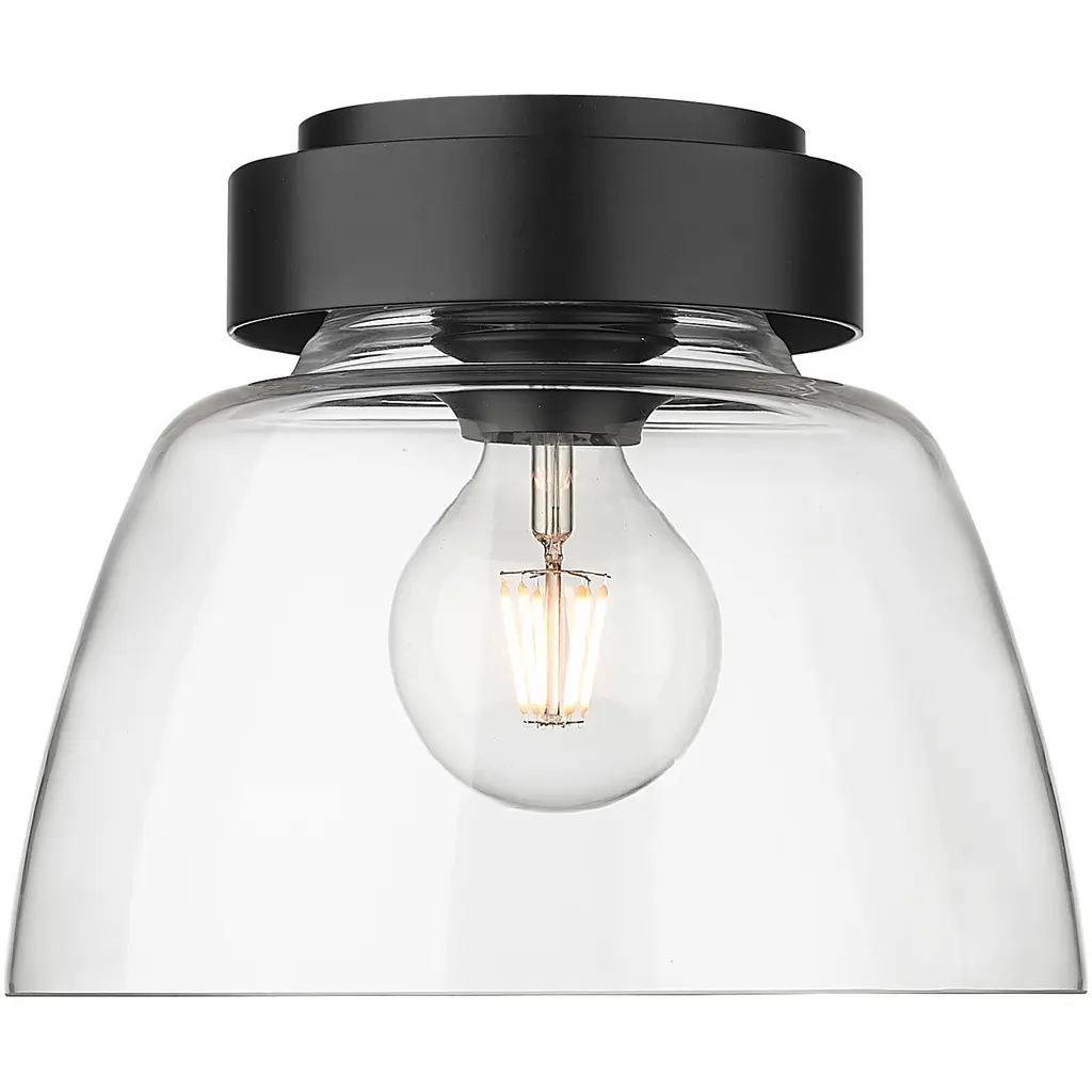 Bring timeless elegance into your home with the Golden Lighting Remy 1-light Flush Mount. Featuring a glass shade and a Matte Black frame, it creates a welcoming atmosphere.The clear glass shade provides brilliant, unobstructed light, allowing the beauty of the bulb and fixture's design to take center stage. Its flawless finish offers a sophisticated touch that complements a variety of decor styles.Embrace the clean, modern style of the Matte Black finish, which not only absorbs light but creates a soft, sophisticated look. This fixture is ideal for low ceilings in hallways, closets, laundry areas, and bathrooms, making it a versatile addition to your home. Damp Location Rated, it's suitable for covered and semi-enclosed spaces with occasional moisture. The overall dimensions are 10"W x 8"H x 10"D, requiring 1 E26 medium base bulb (not included) with a maximum wattage of 100.Elevate your space with this beautiful blend of form and function, crafted with quality in mind.