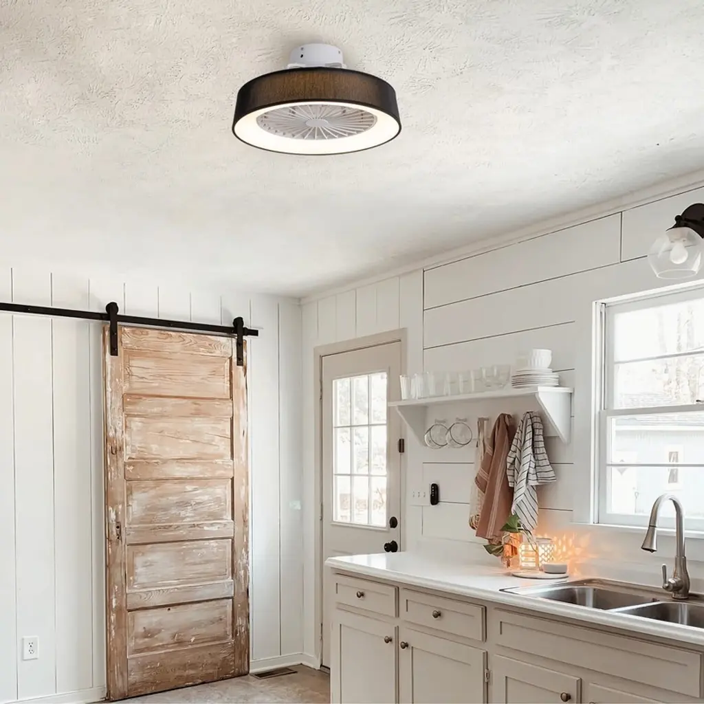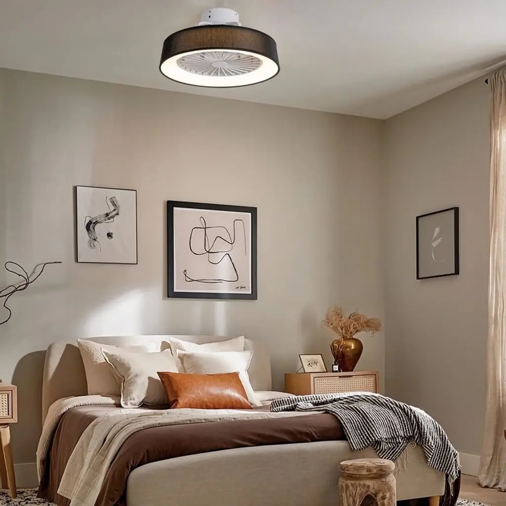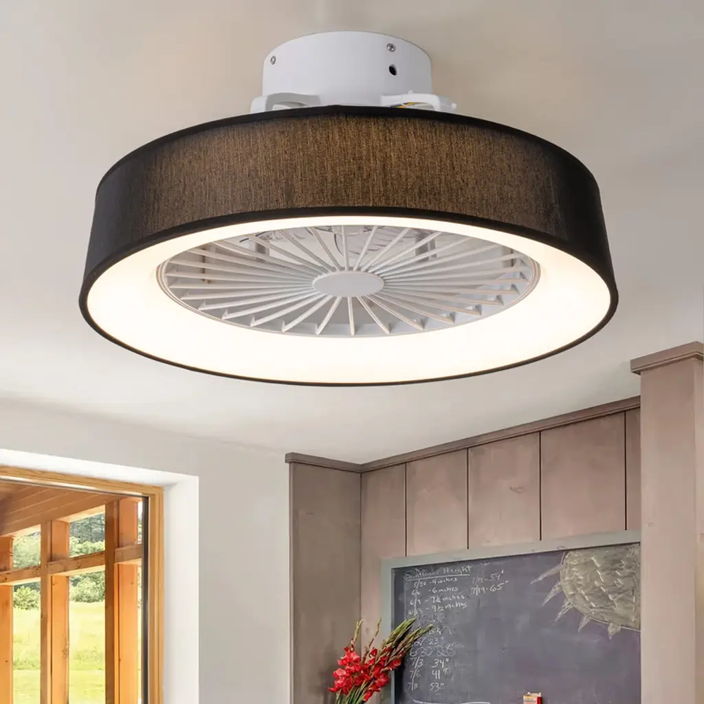 Elevate your home with this 18" Boho linen ceiling fan, featuring a modern black fabric shade that brings texture and warmth to any space. The 2-color dimmable LED provides customized ambiance, while 7 ultra-quiet ABS blades and a 6-speed reversible motor ensure optimal airflow all year. Easily control lighting and fan speed with the included remote. Designed for easy installation and made from environmentally friendly materials, this fan combines aesthetic appeal with practical function. Perfect for bedrooms, living rooms, or studios seeking a stylish, eco-conscious solution.