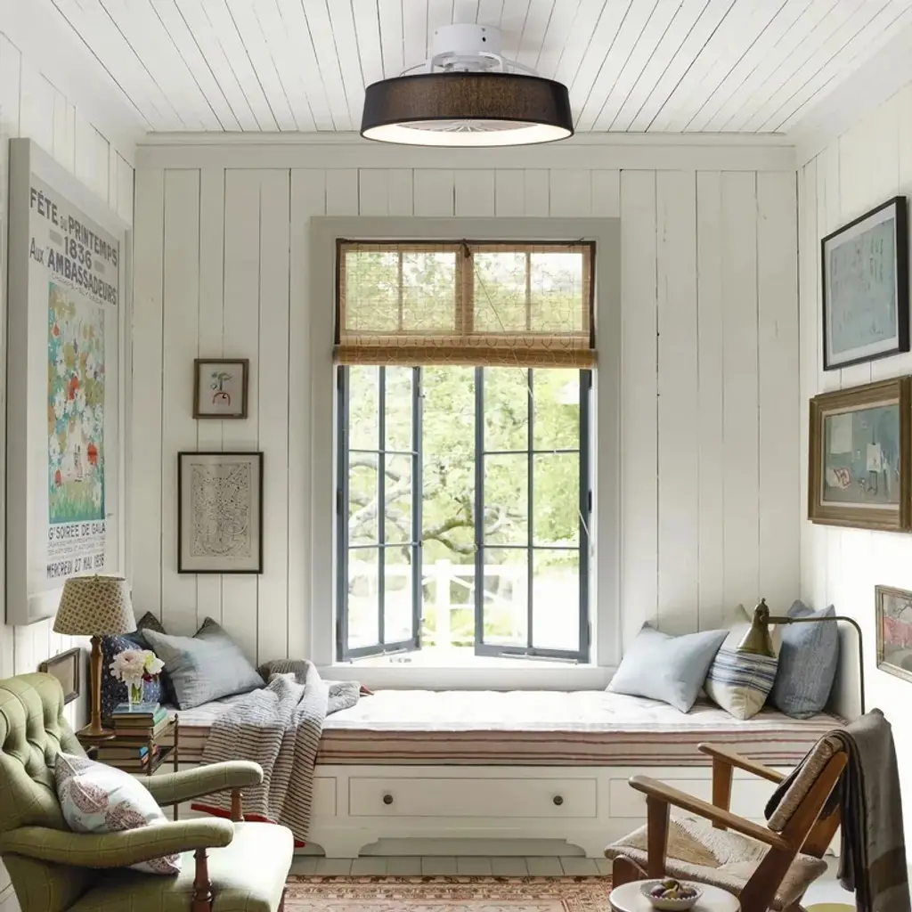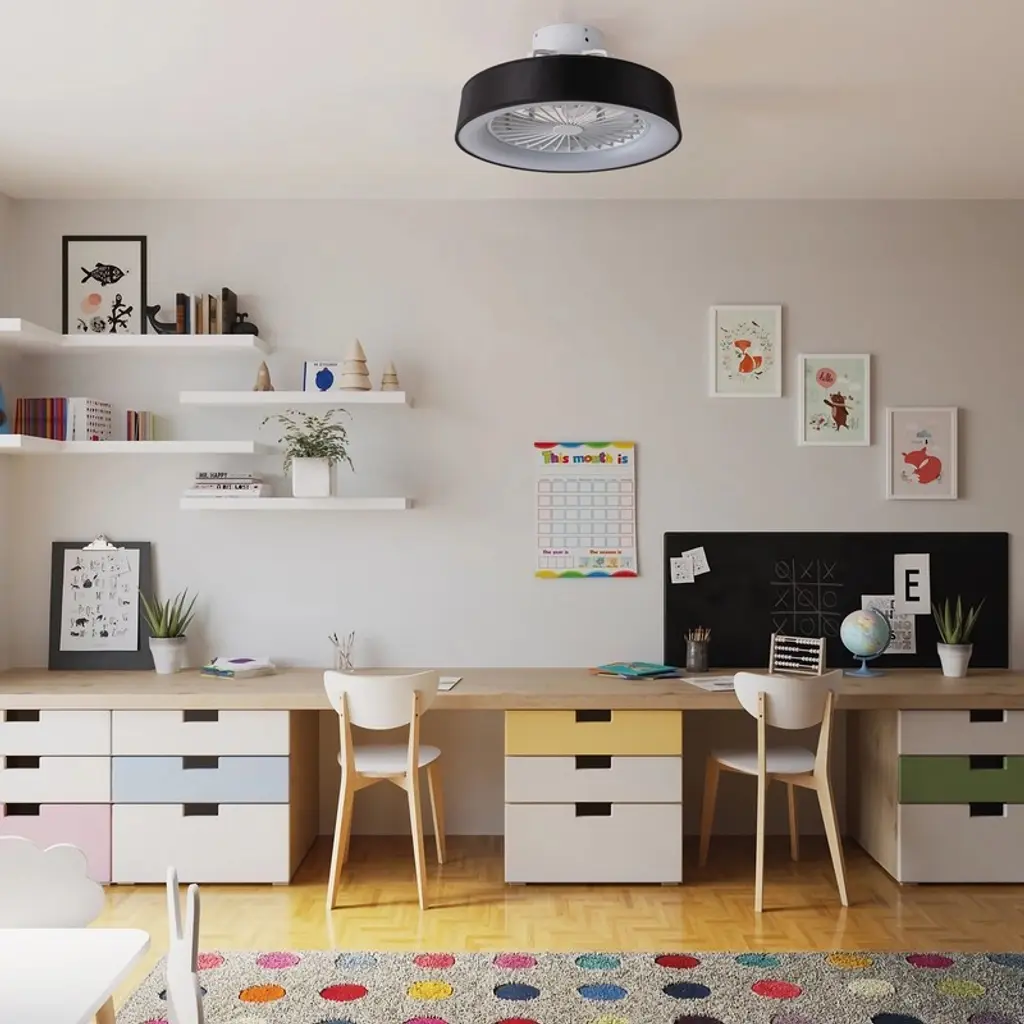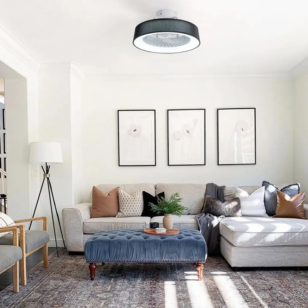 Elevate your home with this 18" Boho linen ceiling fan, featuring a modern black fabric shade that brings texture and warmth to any space. The 2-color dimmable LED provides customized ambiance, while 7 ultra-quiet ABS blades and a 6-speed reversible motor ensure optimal airflow all year. Easily control lighting and fan speed with the included remote. Designed for easy installation and made from environmentally friendly materials, this fan combines aesthetic appeal with practical function. Perfect for bedrooms, living rooms, or studios seeking a stylish, eco-conscious solution.