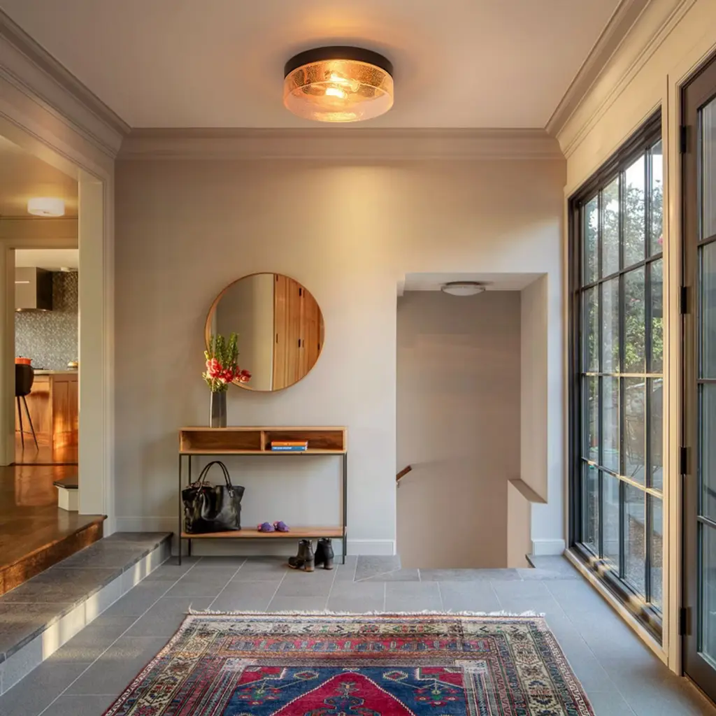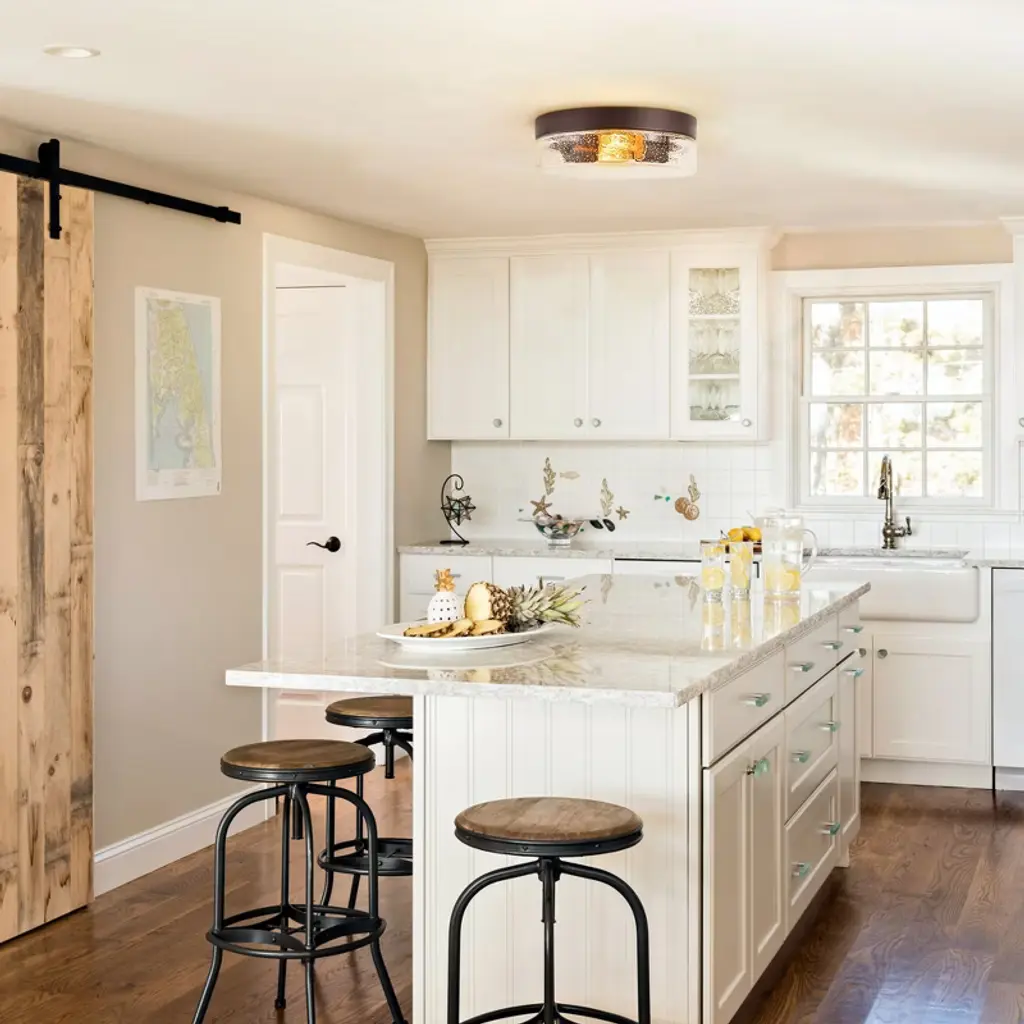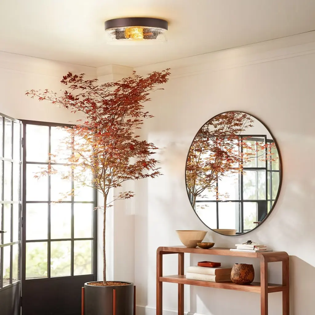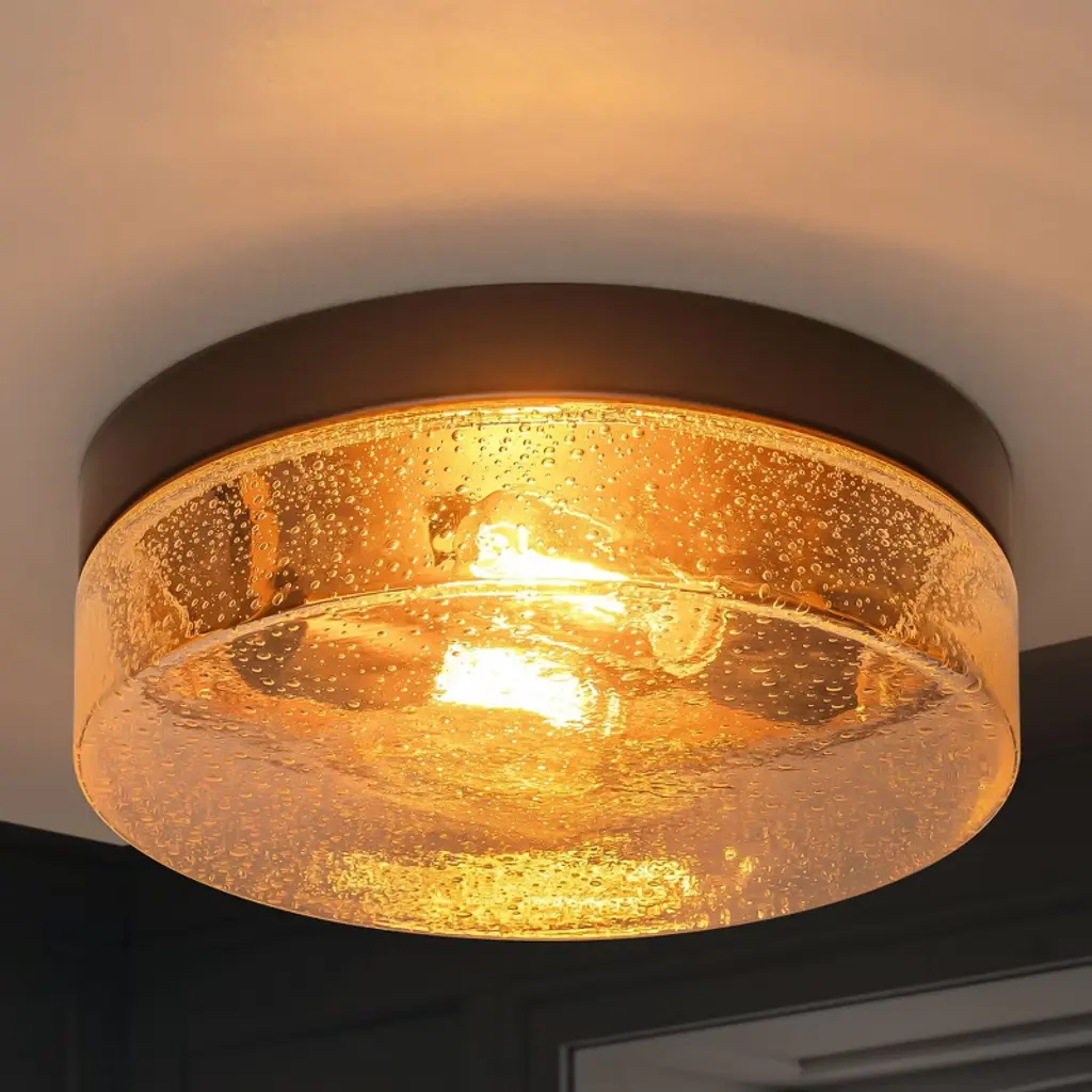 Showcase contemporary elegance with this 11" flush mount featuring distinctive seeded glass that creates a textured glow, adding depth and character to any room. Designed with two E26 sockets compatible with 40W bulbs (not included), it supports dimmable lighting for customized ambiance. Easy to install with all necessary hardware included, this fixture blends modern style and functionality, perfect for sophisticated spaces seeking both charm and adaptability.