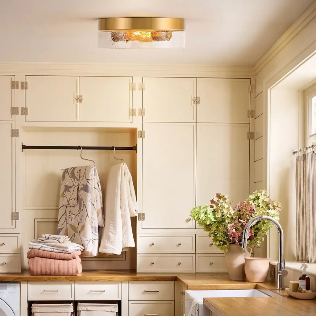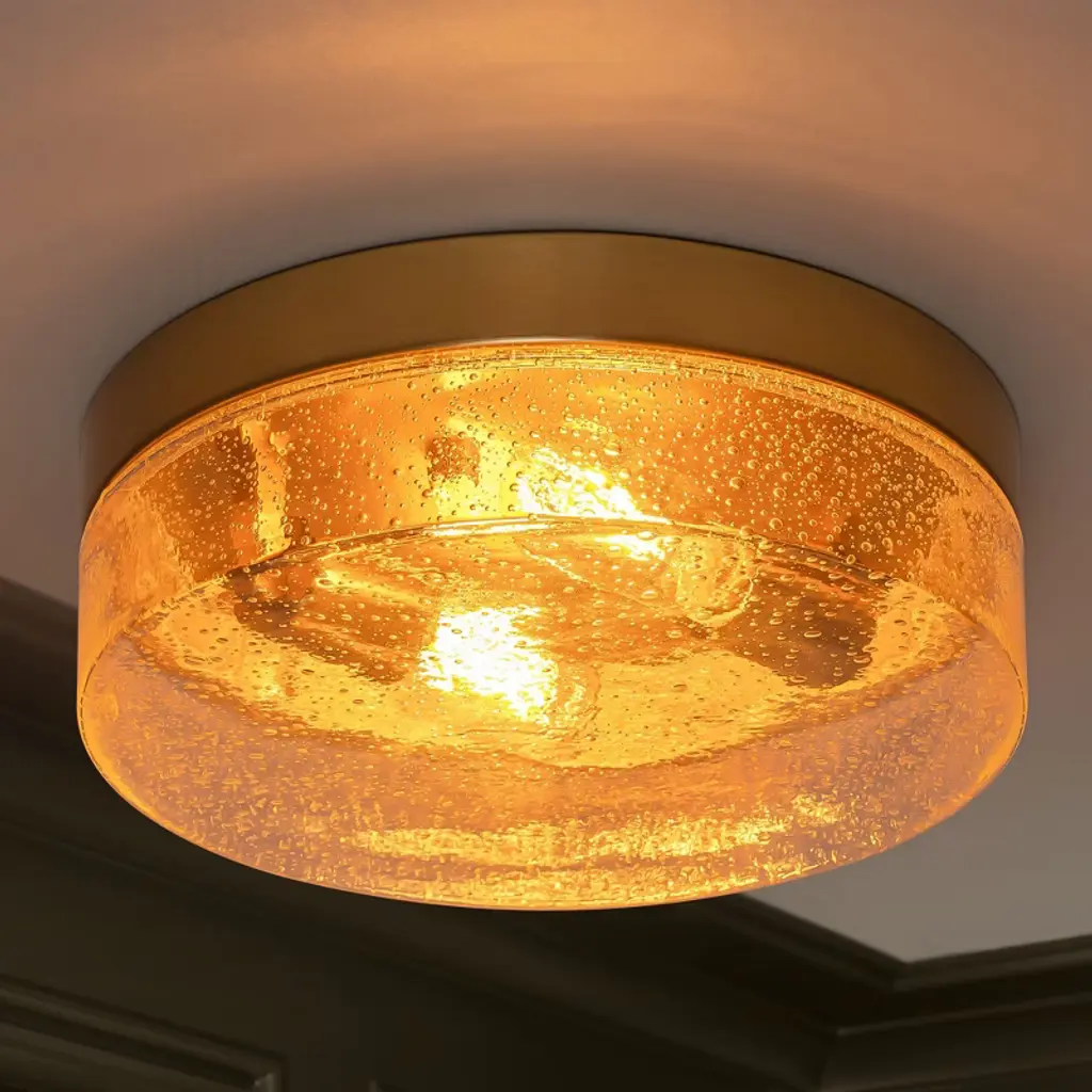 Showcase contemporary elegance with this 11" flush mount featuring distinctive seeded glass that creates a textured glow, adding depth and character to any room. Designed with two E26 sockets compatible with 40W bulbs (not included), it supports dimmable lighting for customized ambiance. Easy to install with all necessary hardware included, this fixture blends modern style and functionality, perfect for sophisticated spaces seeking both charm and adaptability.
