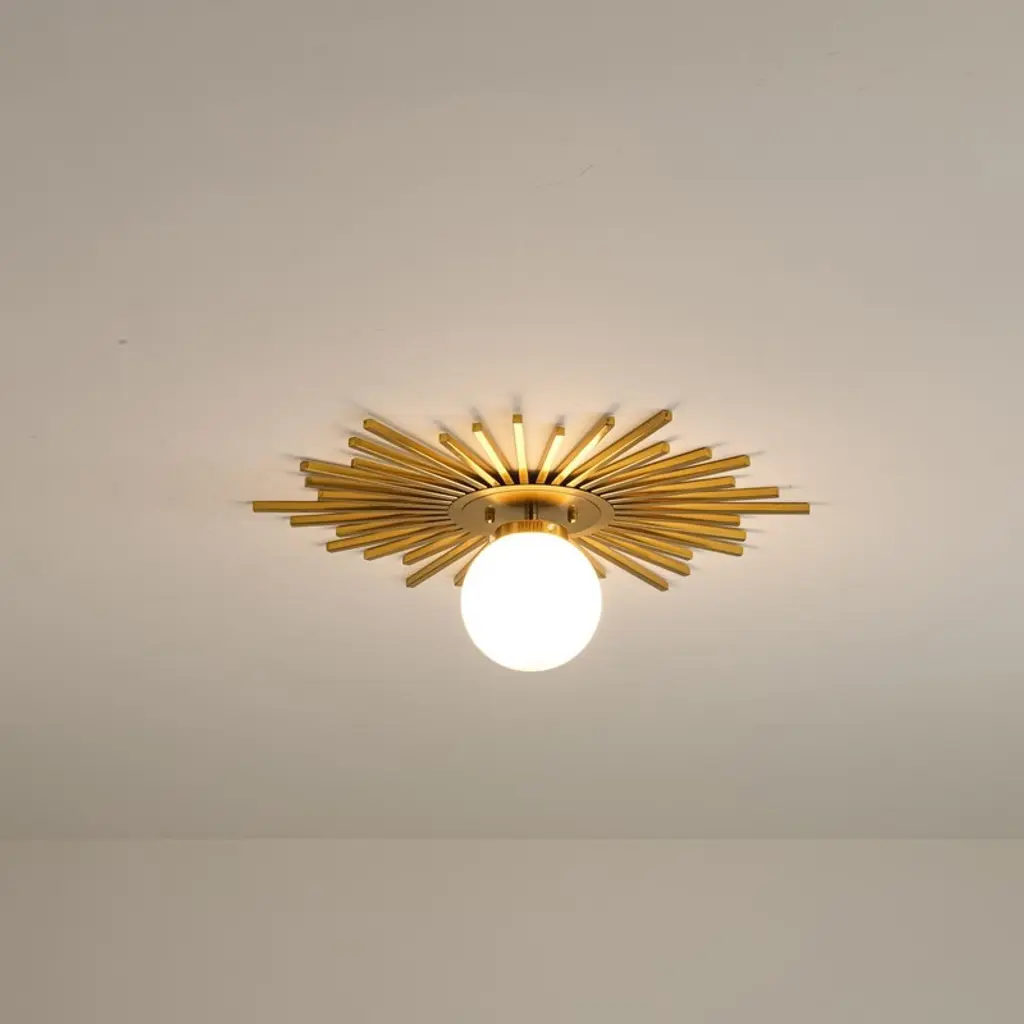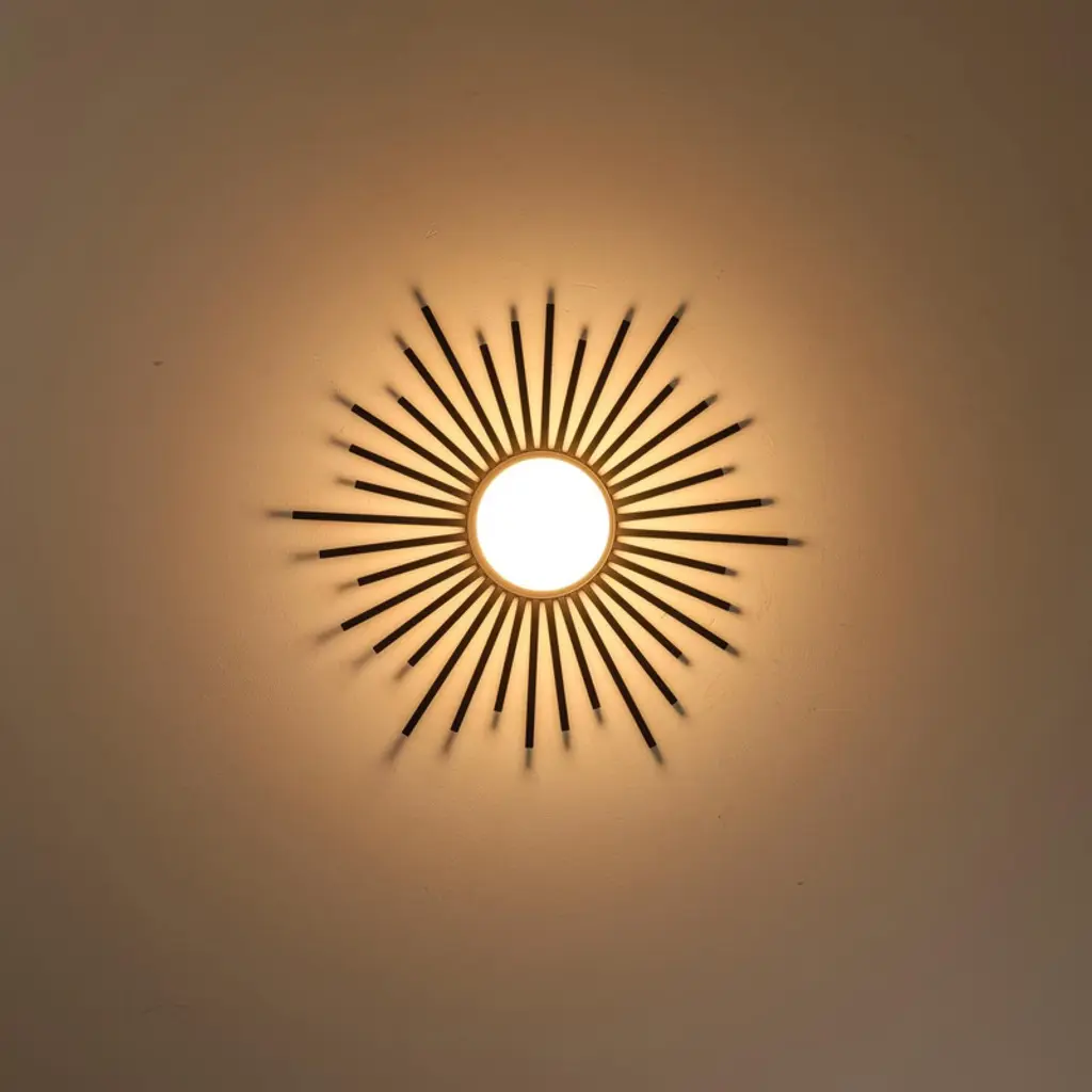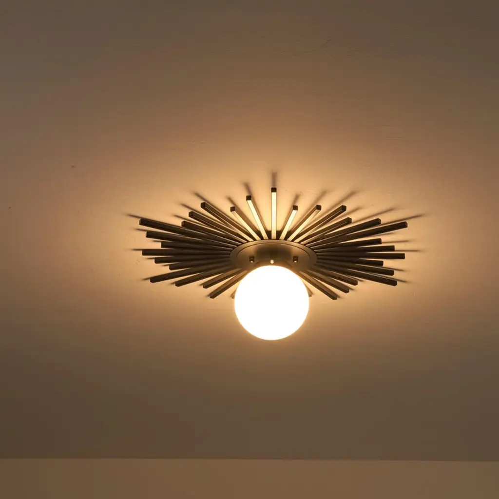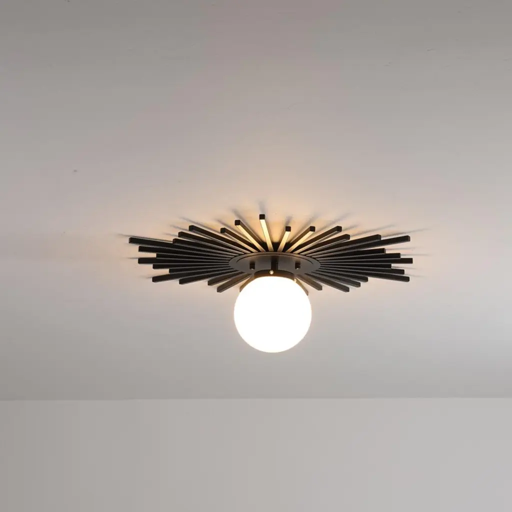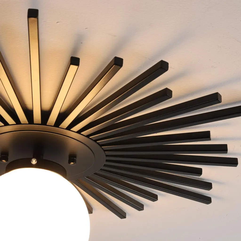 Elevate your interior with this stunning dimmable flush mount featuring a bold sunburst design and vintage black finish. The sculptural silhouette acts as an eye-catching centerpiece, adding Mid-Century Modern charm and artistic character to any space. A central milk glass diffuser softens the light for a glare-free, cozy ambiance, ideal for living rooms, bedrooms, or entryways. Its flush profile maximizes headroom and makes it perfect for lower ceilings. Easy to install and crafted with premium materials, this fixture offers both functionality and sophisticated style¡ªperfect for those who appreciate standout lighting with a decorative edge.