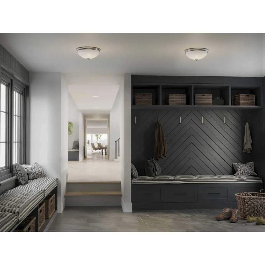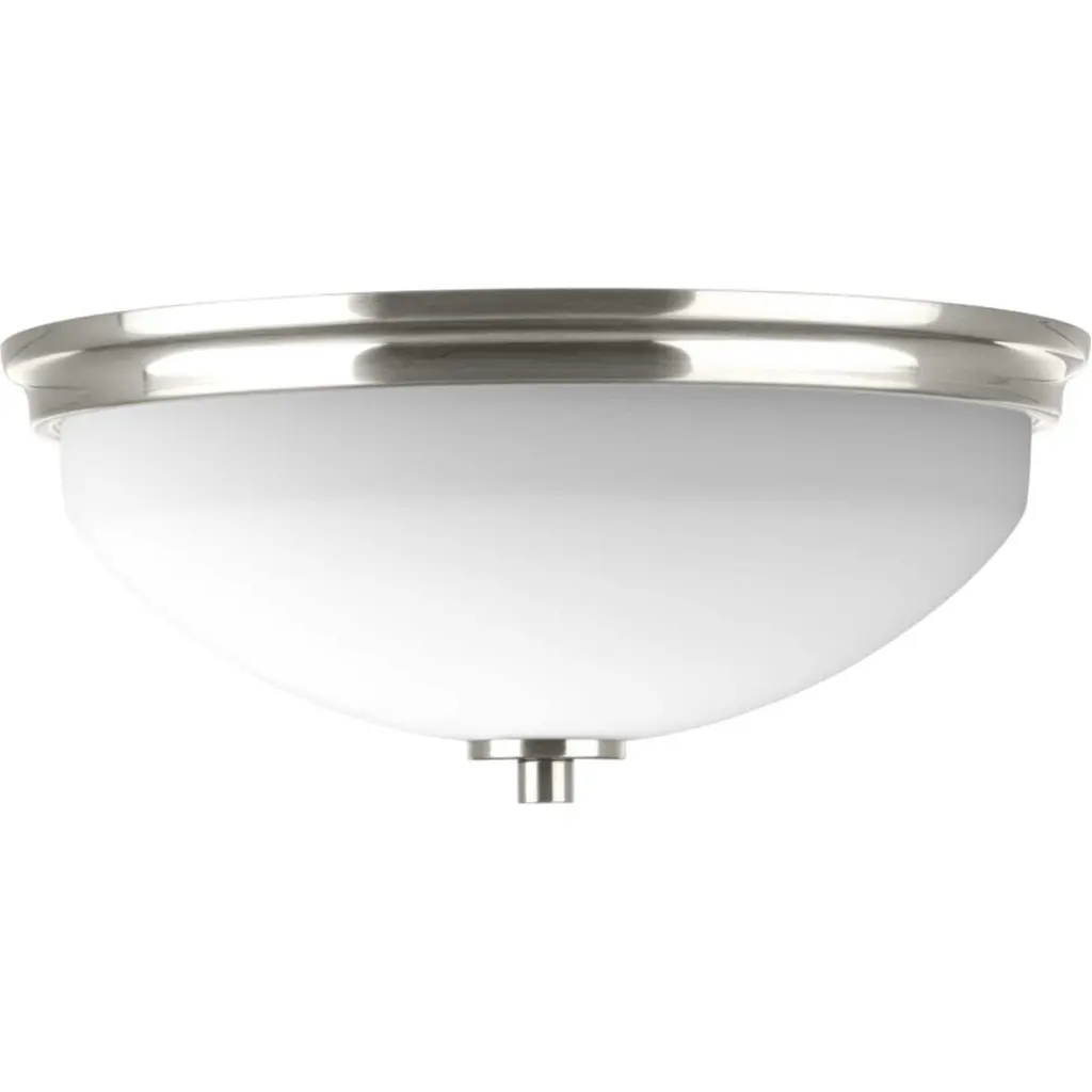 The two-light Replay flush mount features a linear form that provides a pleasingly elegant accent to your home. A sleek, metallic finish is complemented by white glass diffusers for a clean, modern silhouette. Brushed Nickel finish.
