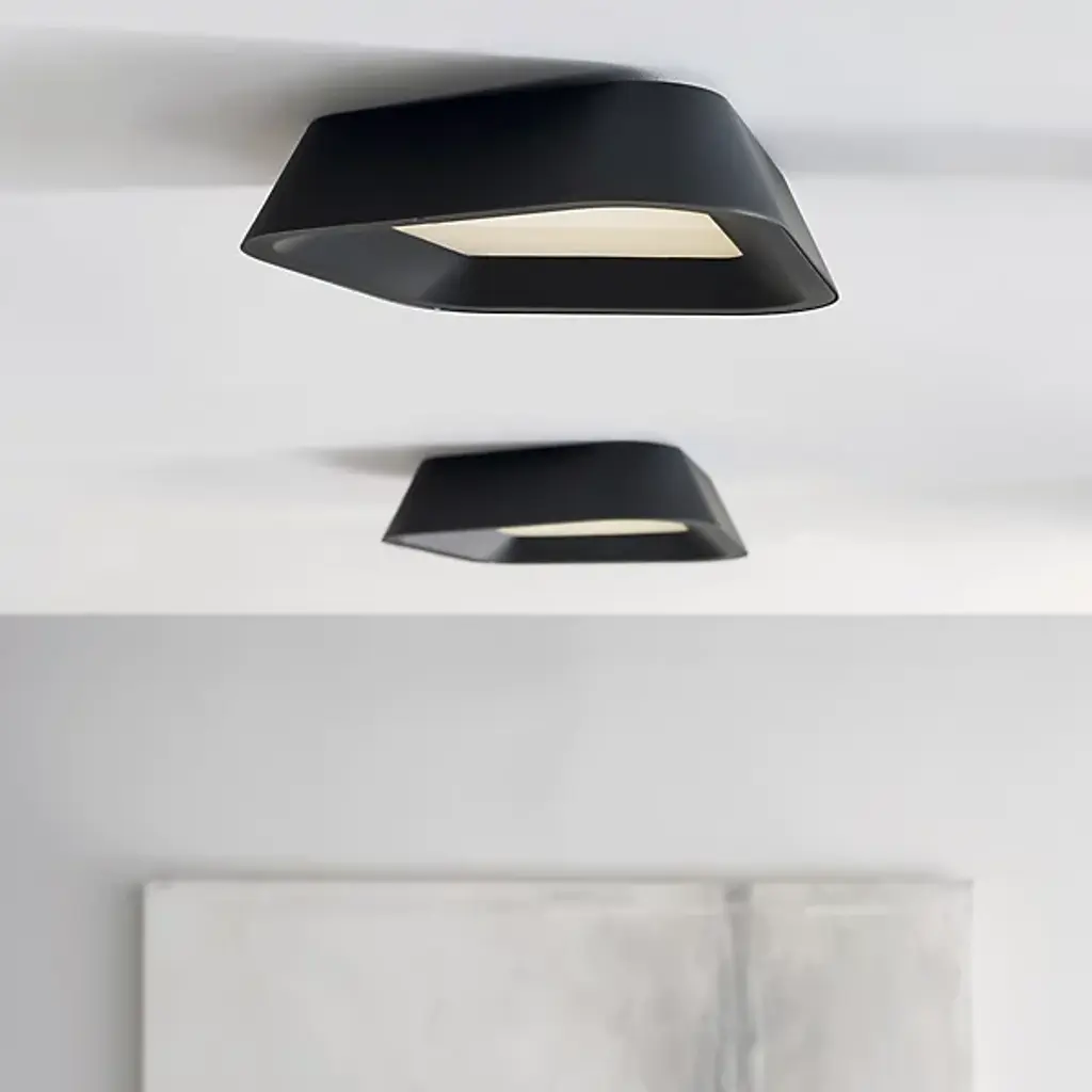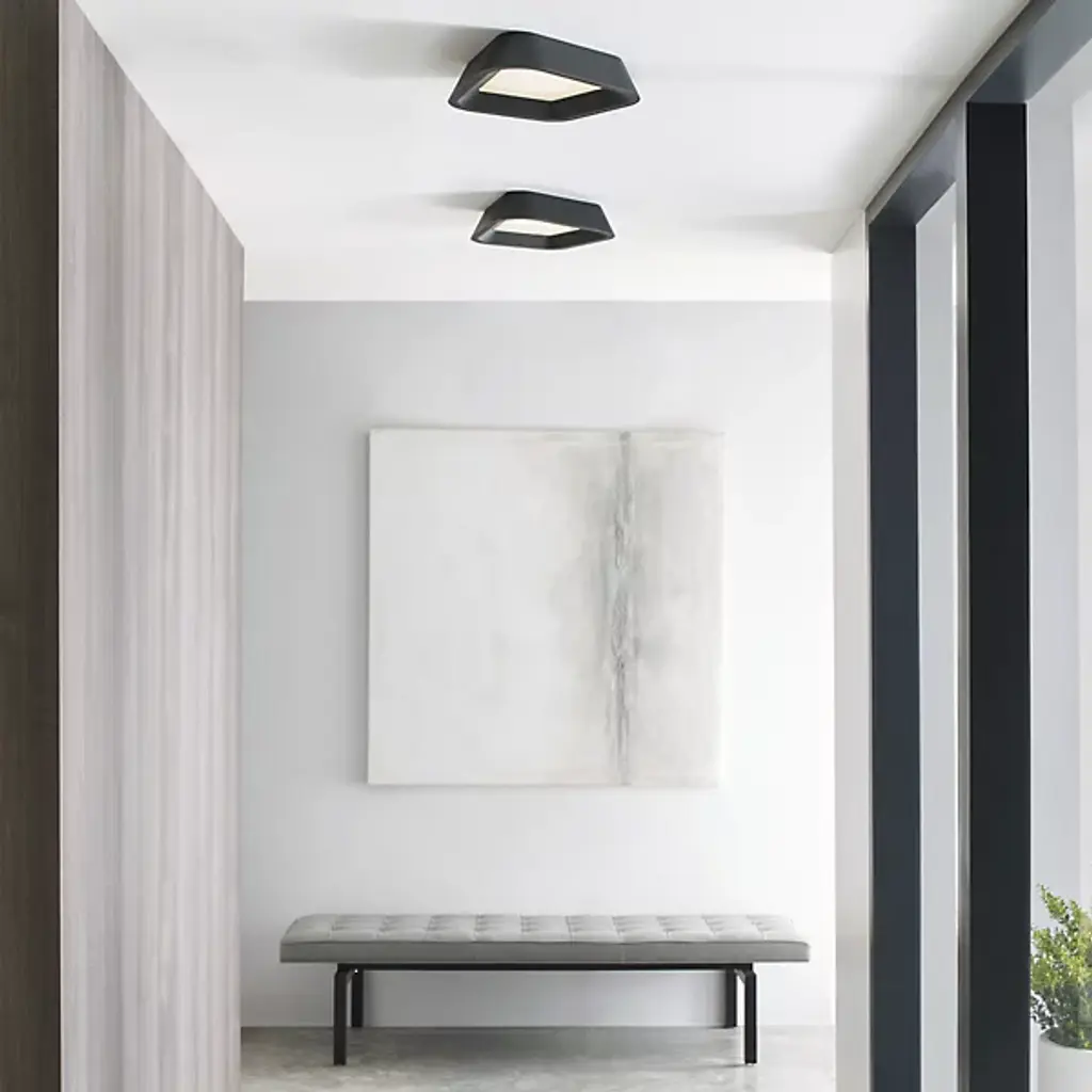 The quirky, modern Rhonan LED Flushmount by Visual Comfort Modern, formerly known as Tech Lighting, features an asymmetrical body with a central recessed acrylic diffuser. Its square-ish metal perimeter extends slightly from the ceiling, guiding the high-output LED light downwards for maximum illumination with minimal glare. With its low-profile, yet artsy design, this flushmount is incredibly versatile, mounting on ceilings or walls in a variety of modern settings.