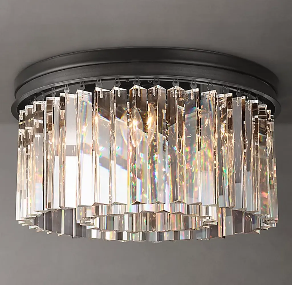 The Art Deco style born in 1920s Paris is evident in the straight-and-curved lines of our elegant lighting. Its optical-quality prisms, arranged in even, concentric rings, hang in sparkling harmony from an iron frame.SHOP THE ENTIRE COLLECTION