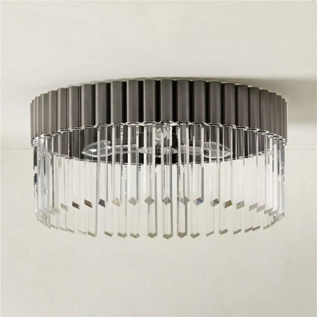 The influence of classic art deco style is evident in the elegant flush mount designedby Donna Piacenza. Curved black frame is juxtaposed against the clean lines of 48 square-faceted crystals, offering the drama of a chandelier with a sophisticated black chrome finish. CB2 exclusive.