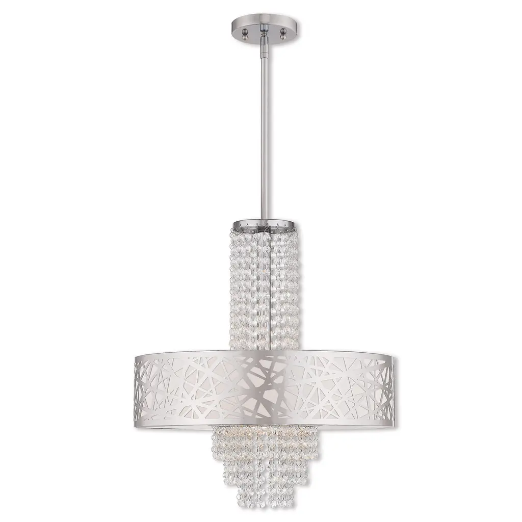 Bring a dramatic focal point to any area of your home with the unique round Riverside collection convertible ceiling mount's stunning style. Cut and polished crystals are held in place with stainless-steel rings and illuminated by brilliant halogen points of light and graced by a beautiful translucent organza shade.