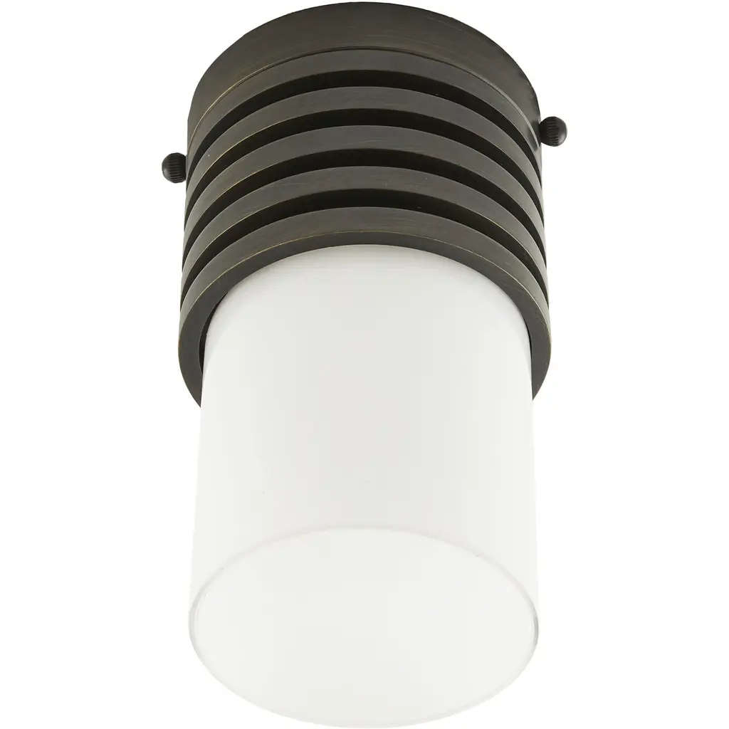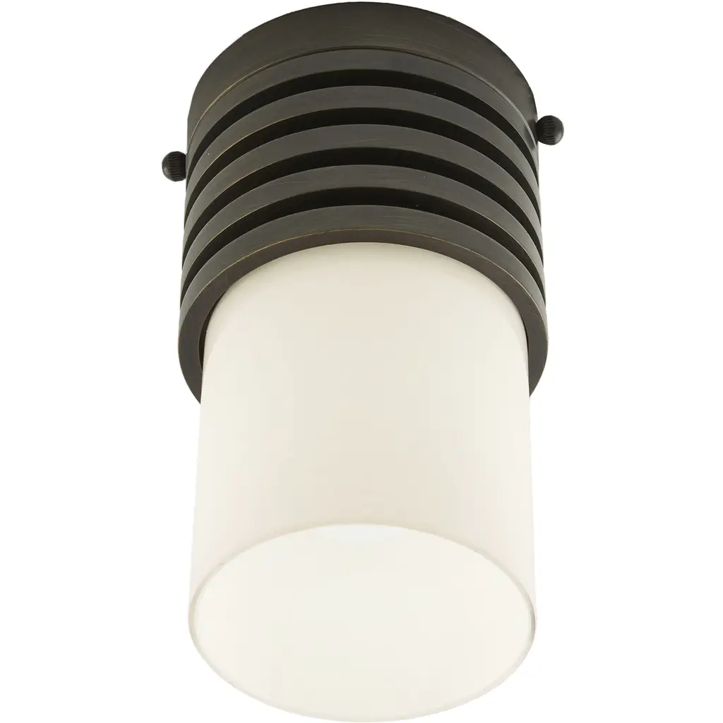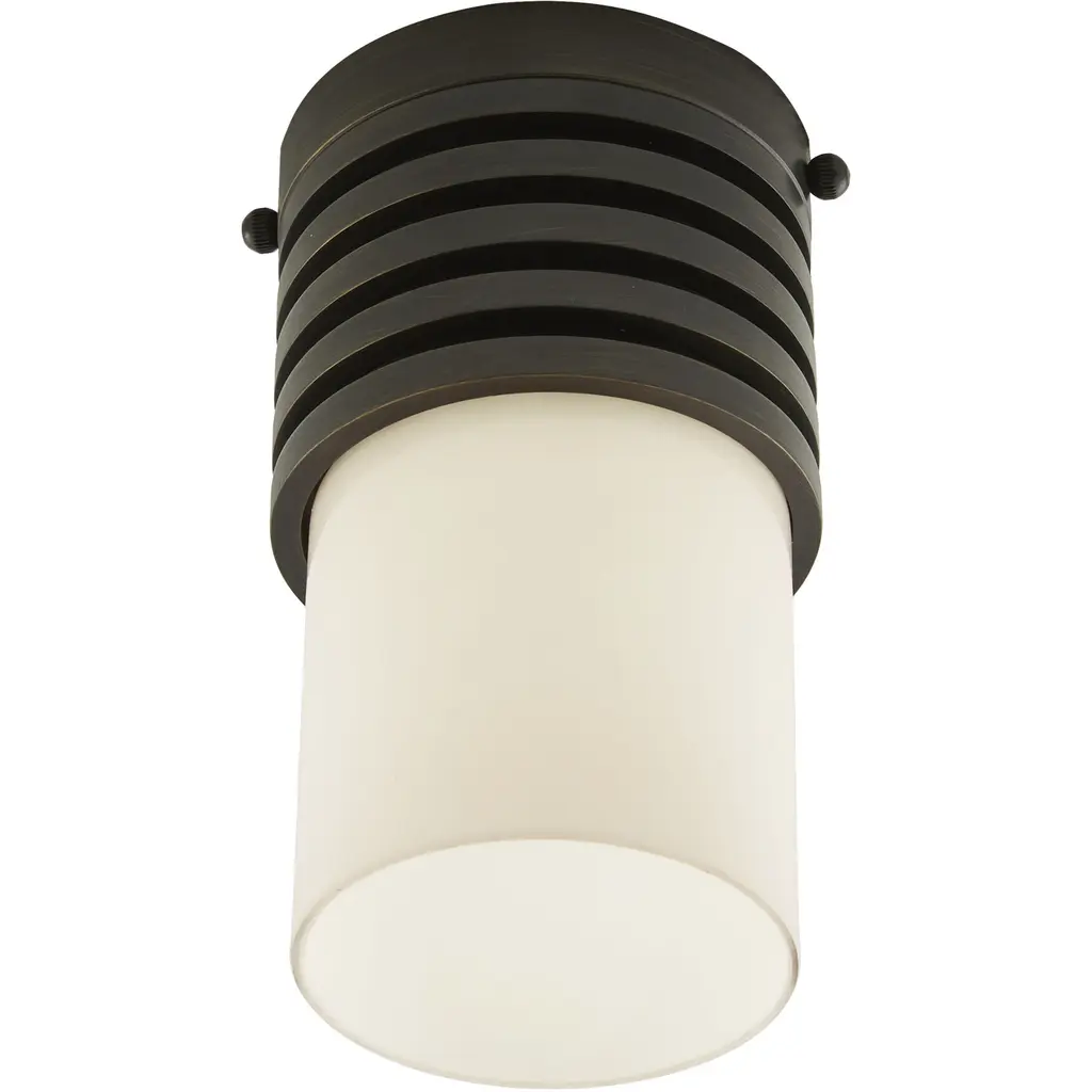Formed with a machined look, as if turned on a lathe, the Rune Flush Mount is finished in English bronze iron with an opal glass cylinder shade. The fixture is scaled as an ideal hallway application or as a decorative swap for can lights.