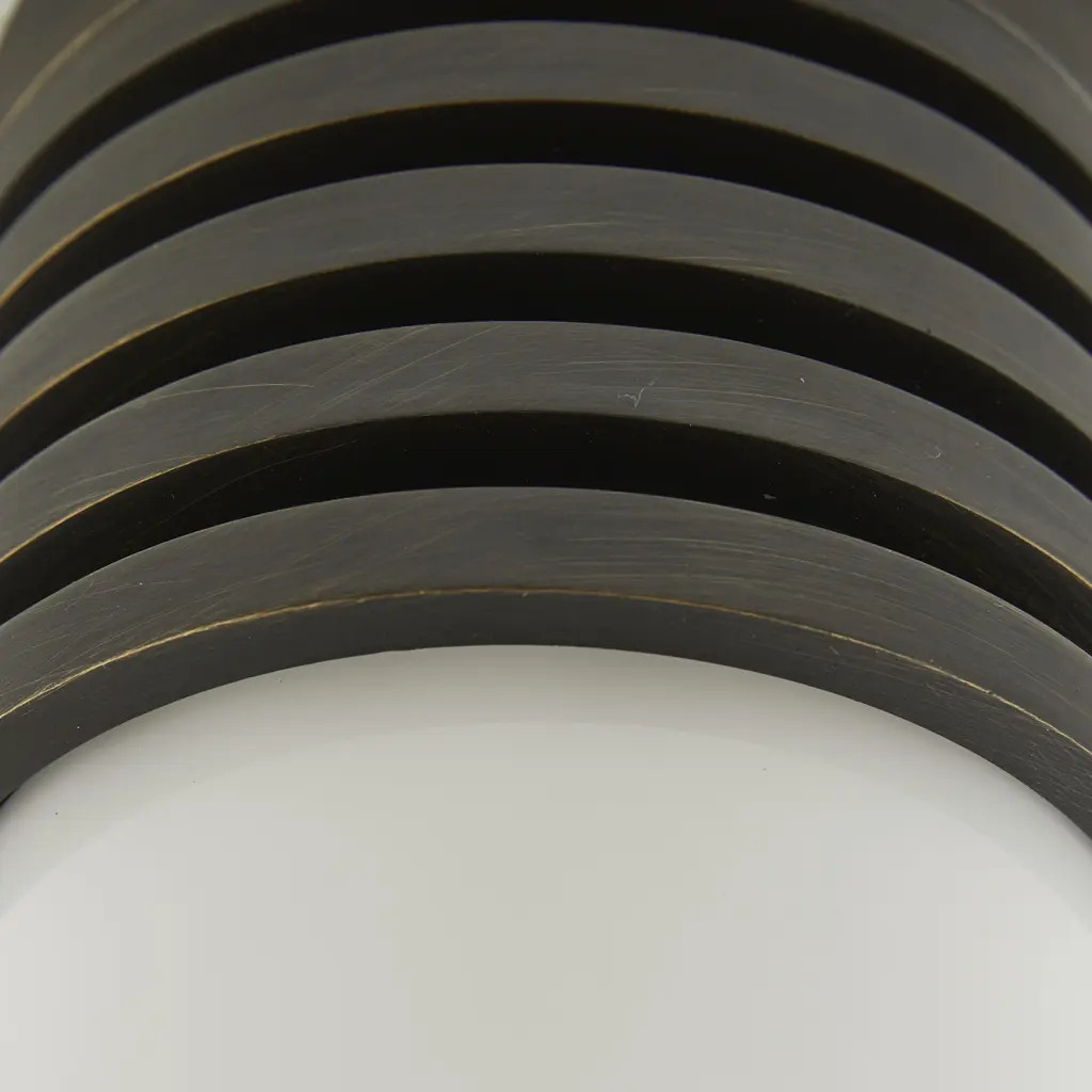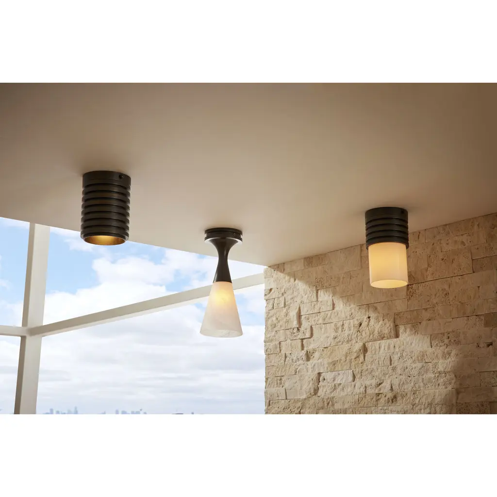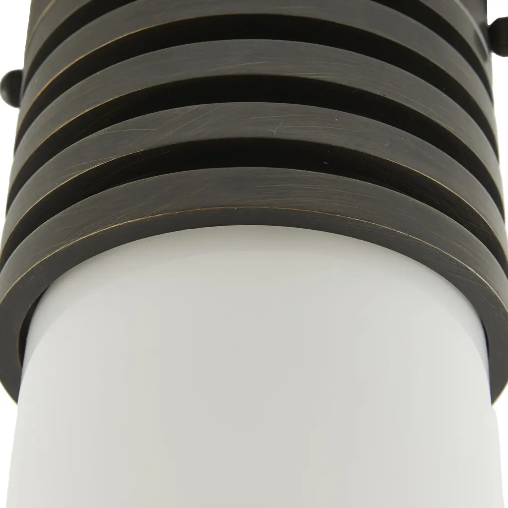 Formed with a machined look, as if turned on a lathe, the Rune Flush Mount is finished in English bronze iron with an opal glass cylinder shade. The fixture is scaled as an ideal hallway application or as a decorative swap for can lights.