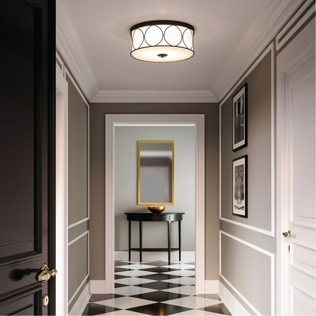 The Rylann 3-light ceiling fixture washes the room in ample ambient light and a touch of transitional style. The white, decorative fabric shade accentuated by an eye-catching laser-cut pattern and white glass diffuser ensure a tasteful glow.