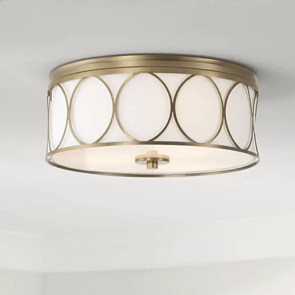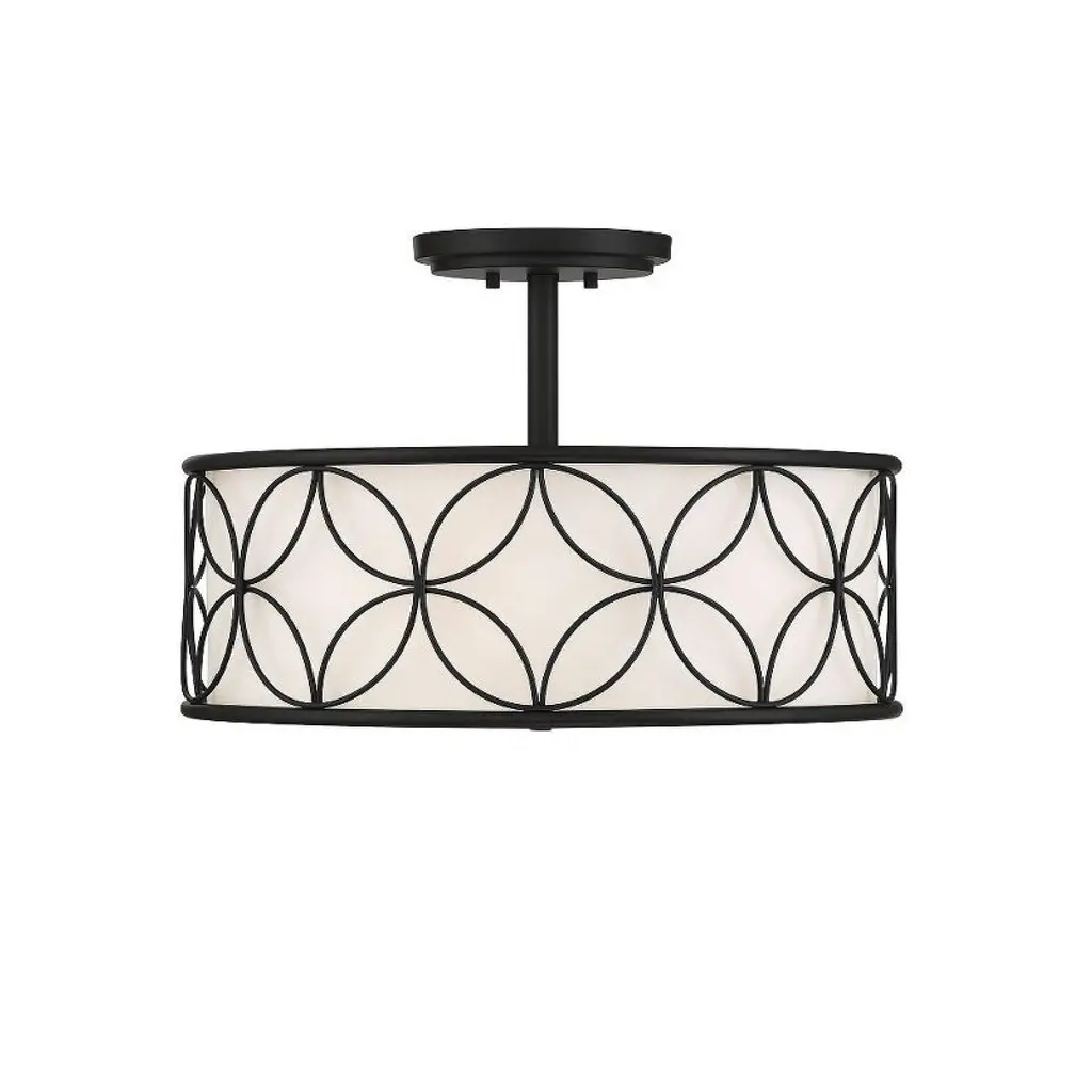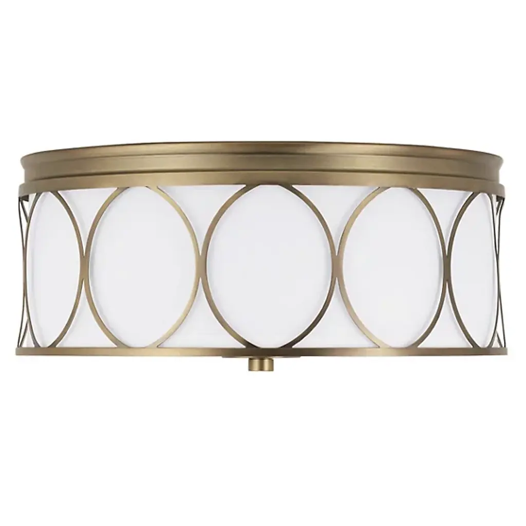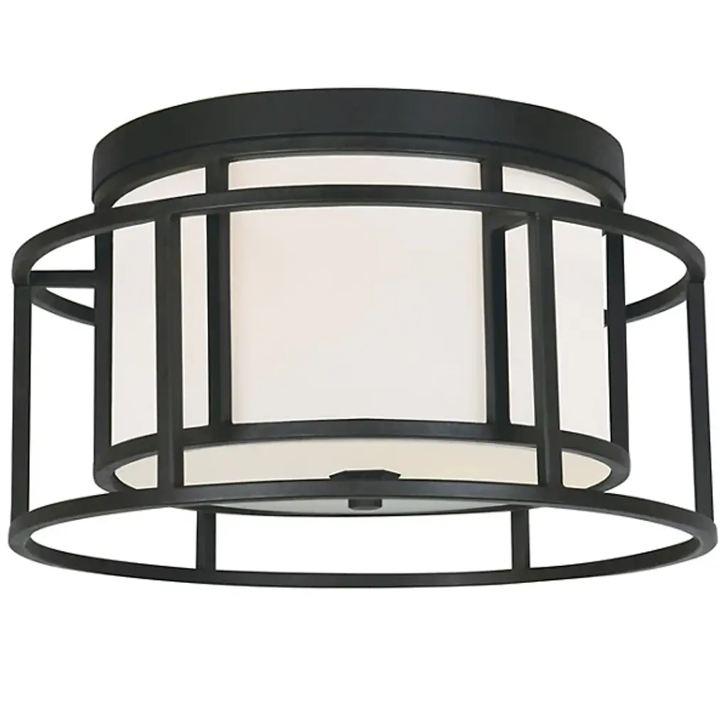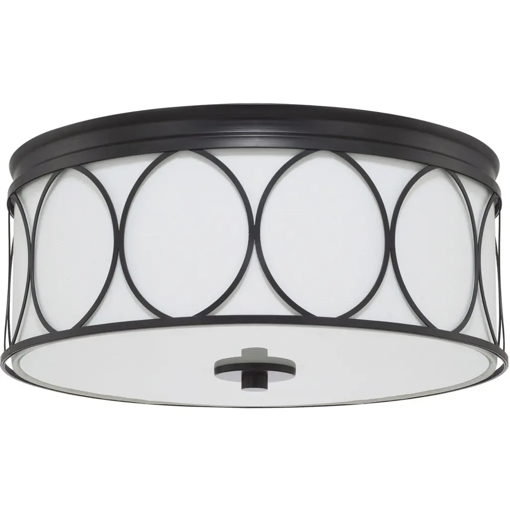 The Rylann Flushmount by Capital Lighting showcases modern styling with traditional elements. The drum-shaped shade is composed of matte fabric, while the bottom features a white glass diffuser accented by a metal finial. Inside, incandescent lamping emits a warm glow that is softly diffused for inviting ambient illumination. The laser-cut metal frame creates a traditional motif along the side of the drum, adding a charming decorative statement that is adaptable to a variety of décor themes.