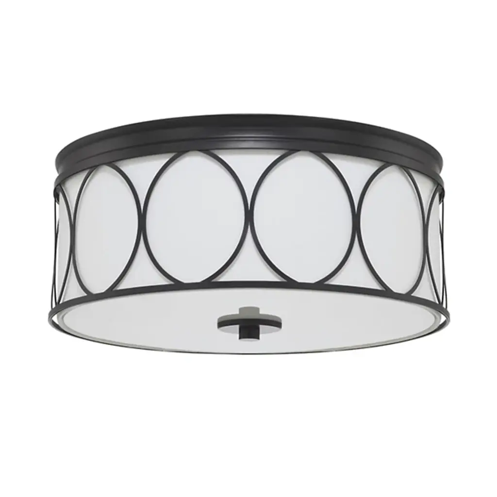 The Rylann Flushmount by Capital Lighting showcases modern styling with traditional elements. The drum-shaped shade is composed of matte fabric, while the bottom features a white glass diffuser accented by a metal finial. Inside, incandescent lamping emits a warm glow that is softly diffused for inviting ambient illumination. The laser-cut metal frame creates a traditional motif along the side of the drum, adding a charming decorative statement that is adaptable to a variety of décor themes.