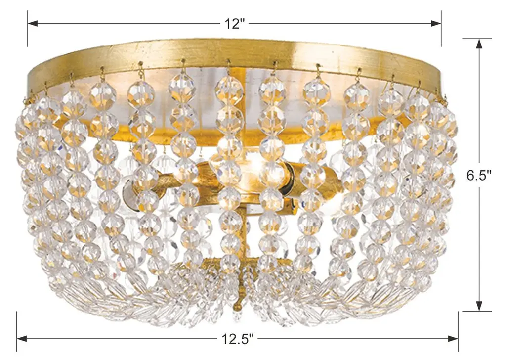 Hundreds of hand-cut crystals adorn this opulent flush mount, beautifully offset by an antiqued golden finish. Hardwired.
