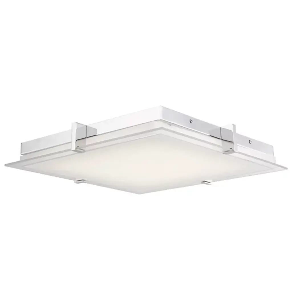 The Sara LED Flushmount from Huxe brightens up hallways with an aura of sophistication underlined by its fine geometric construction. A square steel canopy frames the piece with sleek, polished form. From it, jetting rectangular brackets organized on each side present stylish accenting underlining the overall symmetry. A frosted glass trim as well as a plate along the base translate brilliant LED light into an inviting and encompassing glow.