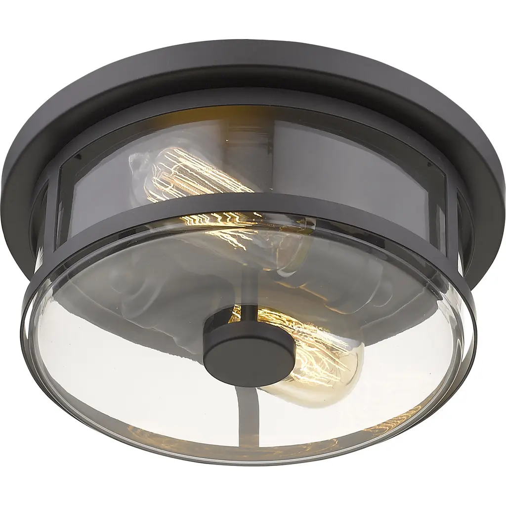 Industrial influences meet chic style in this mid-century modern two-light flush mount. A rustic western bronze finish emphasizes the simplicity of the clear glass small cylinder shade.
