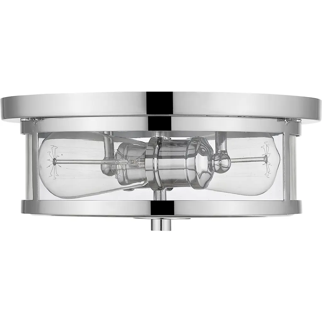 Contemporary bold touches give this mid-century modern two-light flush mount audacious elegance. Underscoring the luminous brightness of the clear glass small cylinder shade is the crisp and shiny chrome finish.