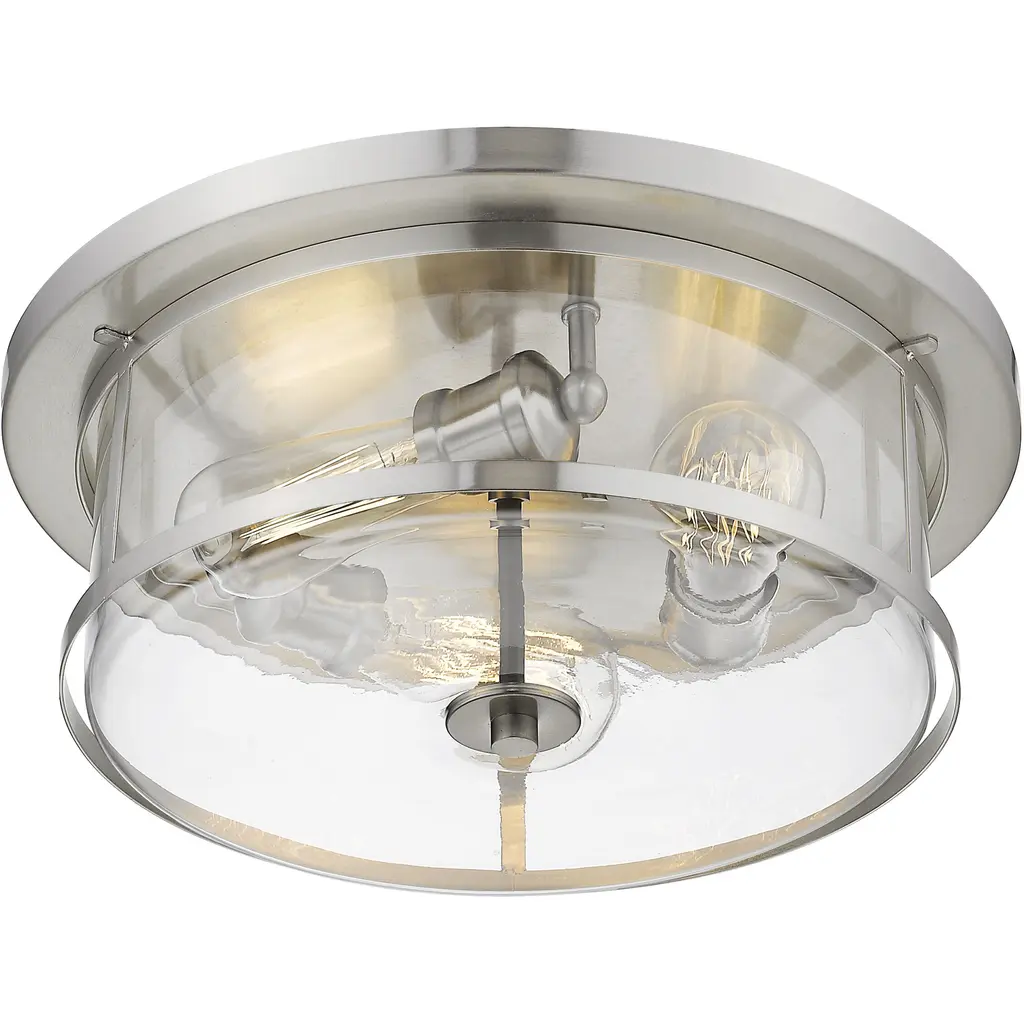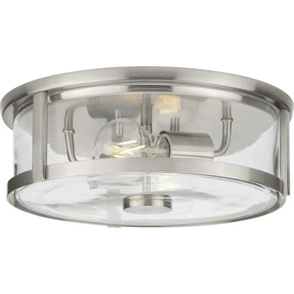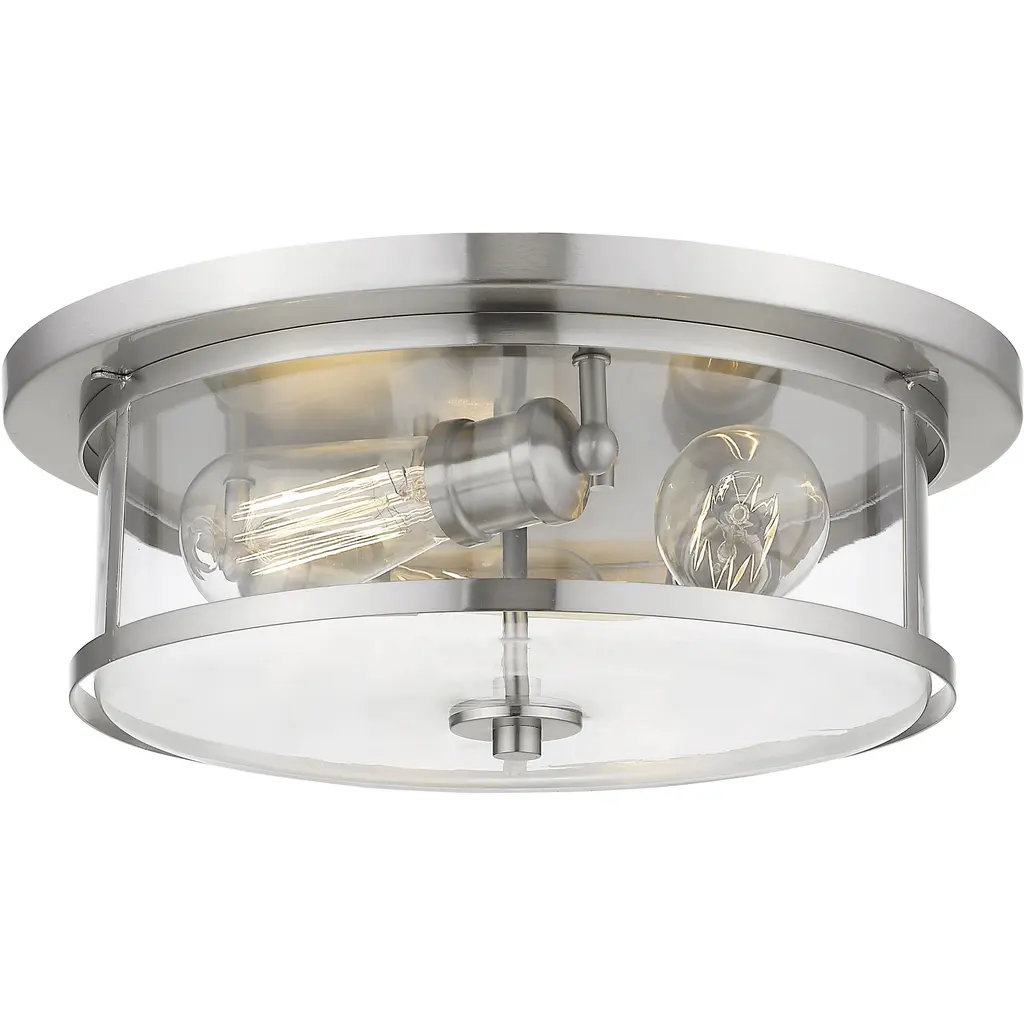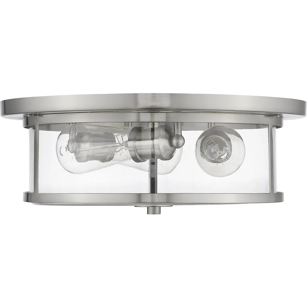 Metropolitan chic touches give this mid-century modern three-light flush mount a lovely refinement. A gleaming brushed nickel finish brilliantly brings dimension to the clear glass small cylinder shade.